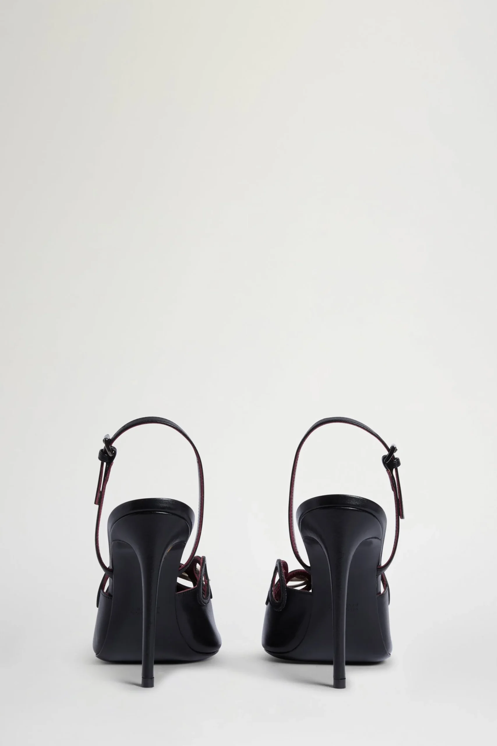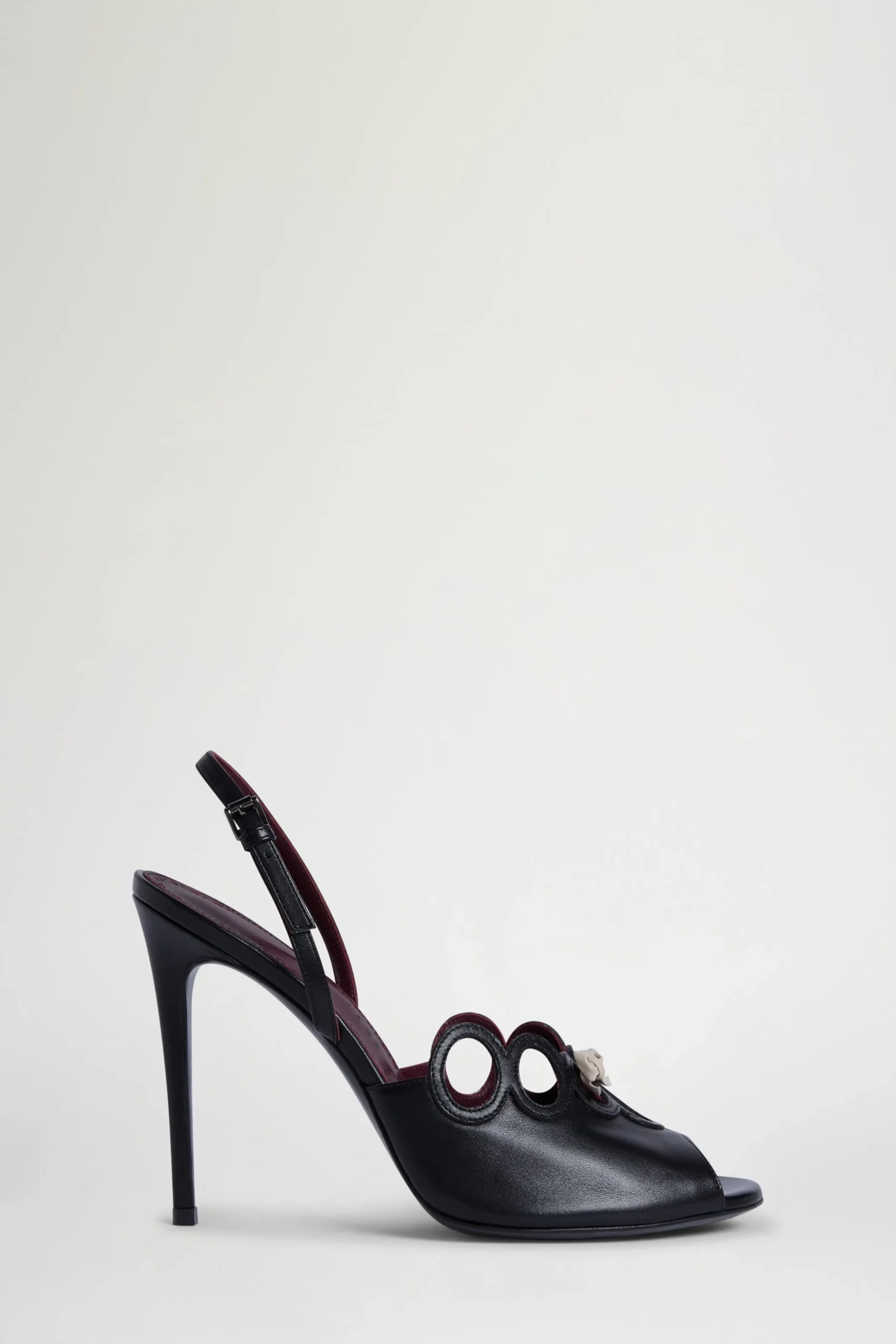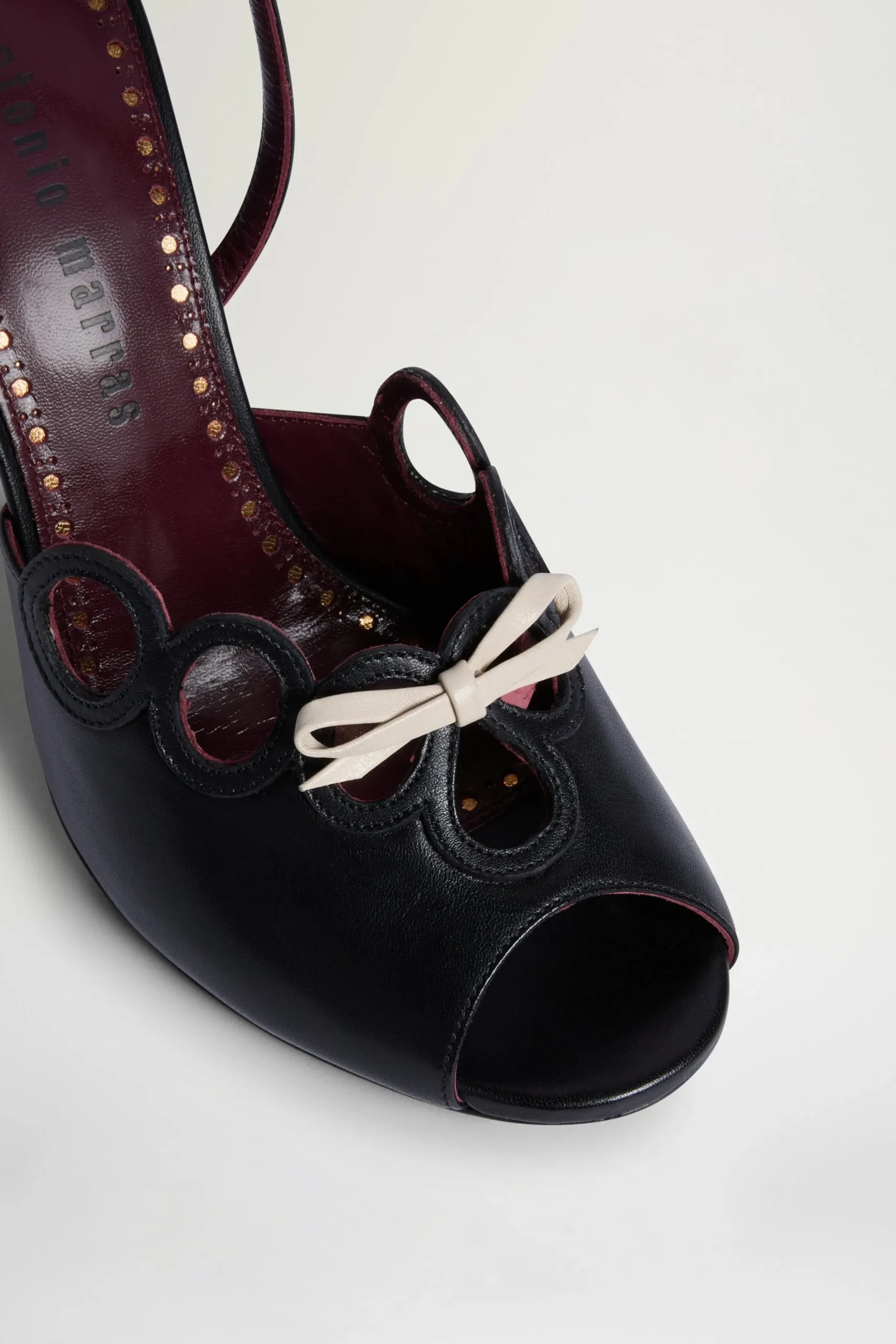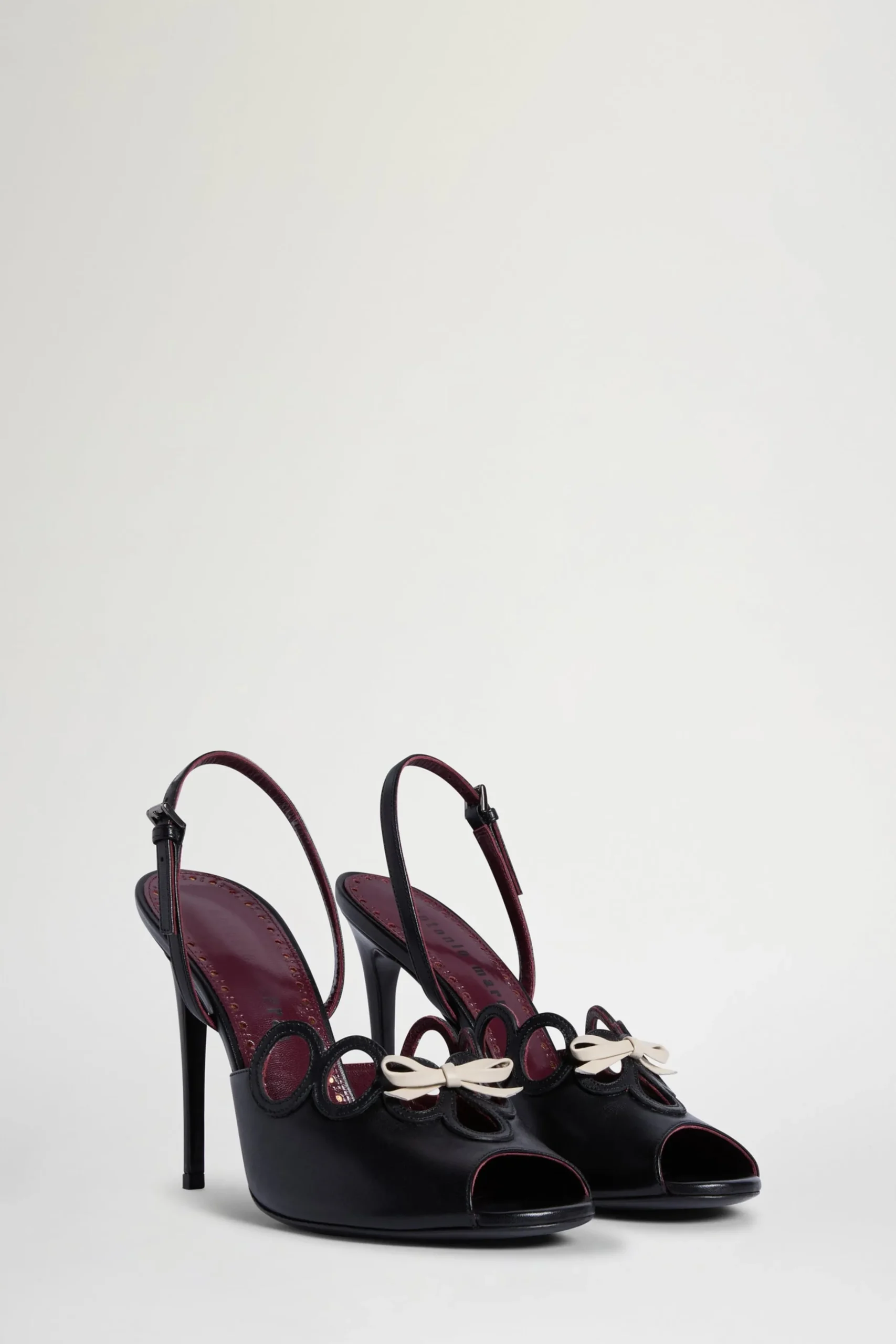 Sandali slingback neri in pelle con tacco alto e fiocco bianco.