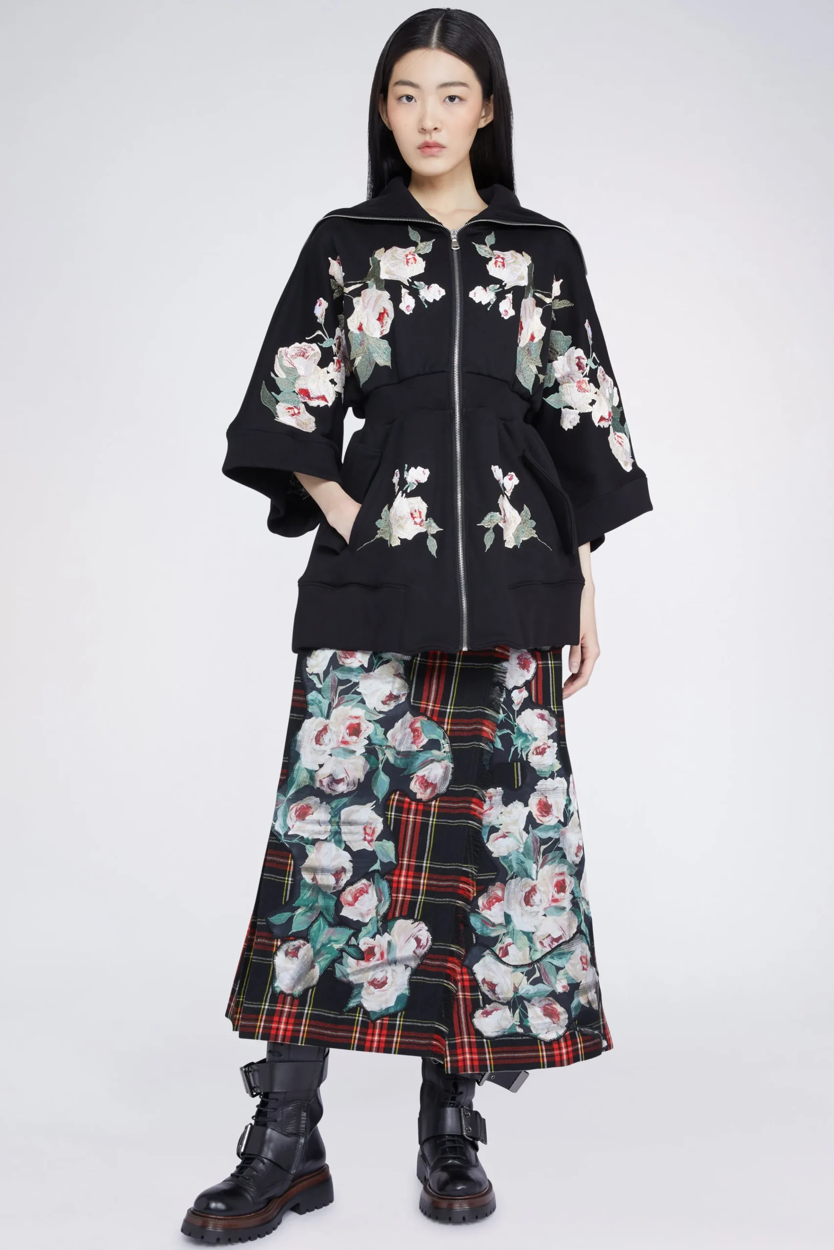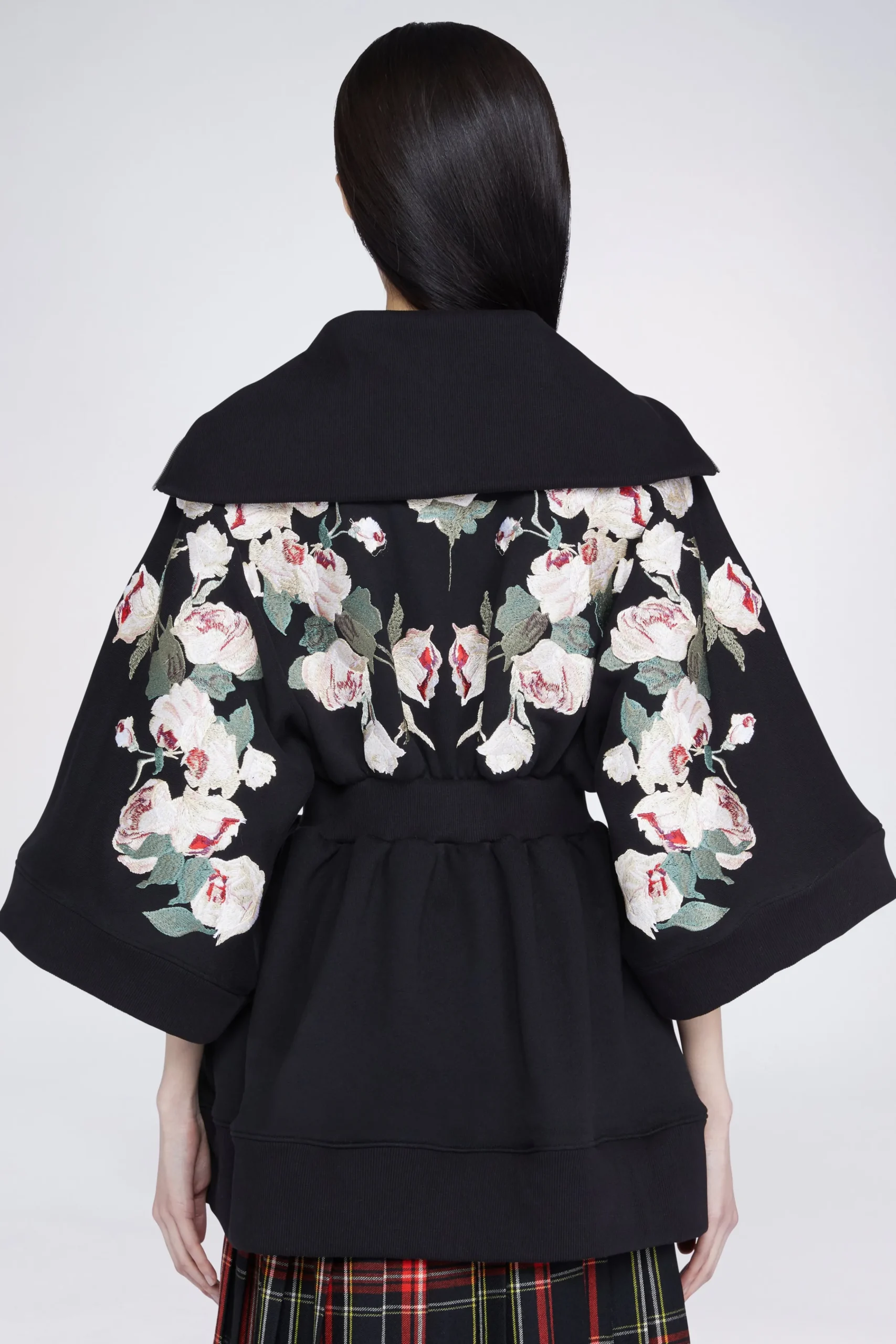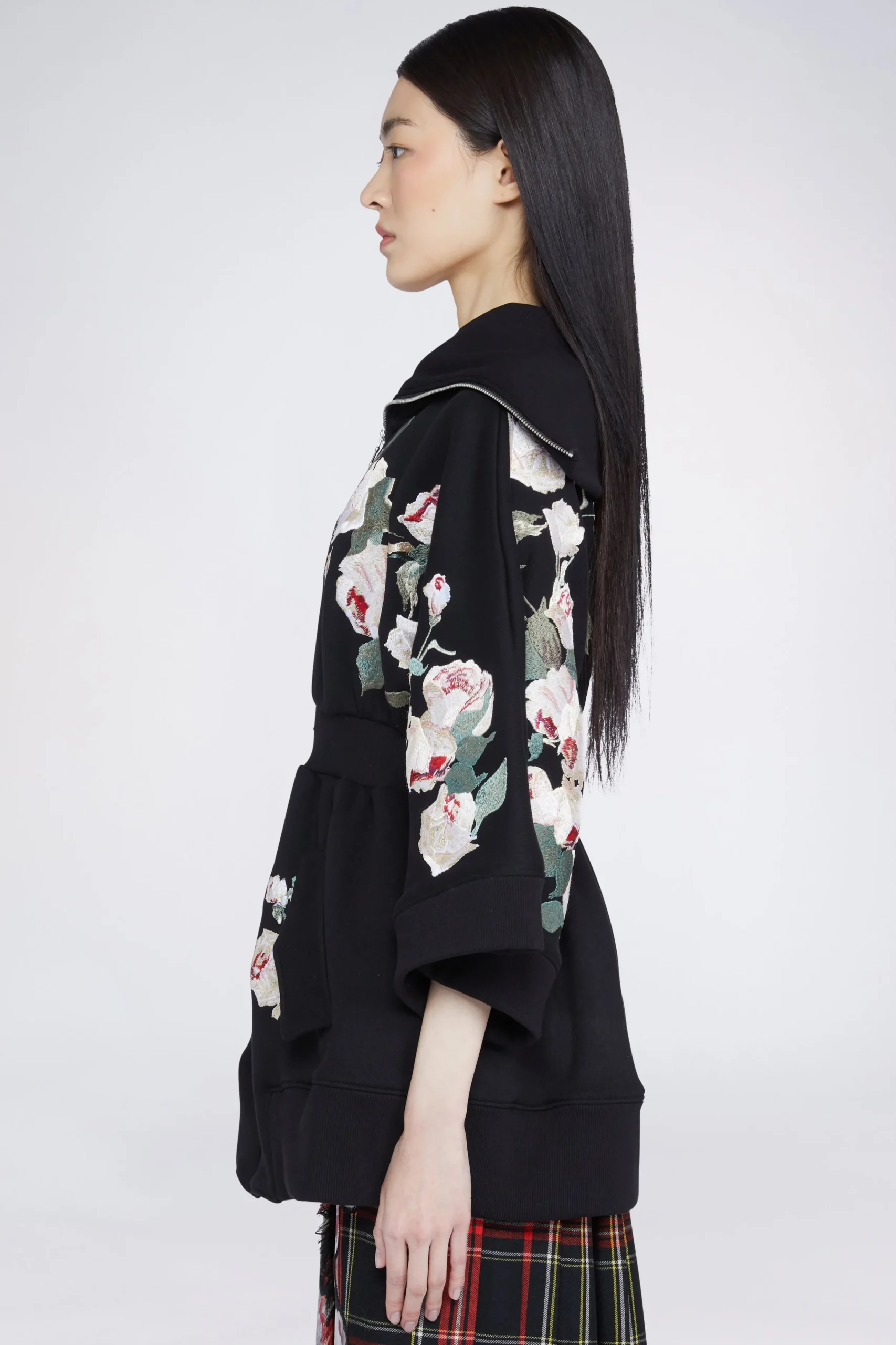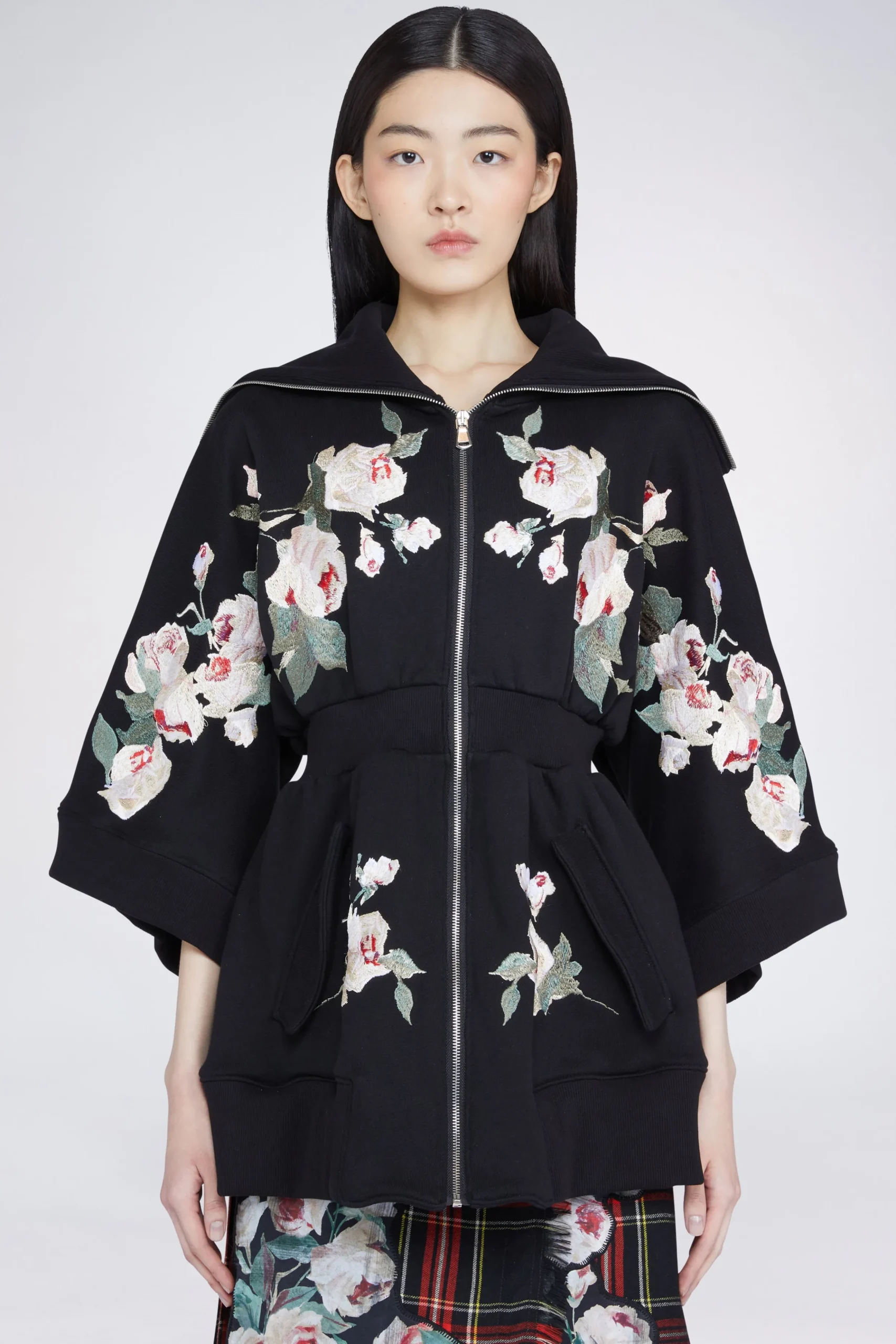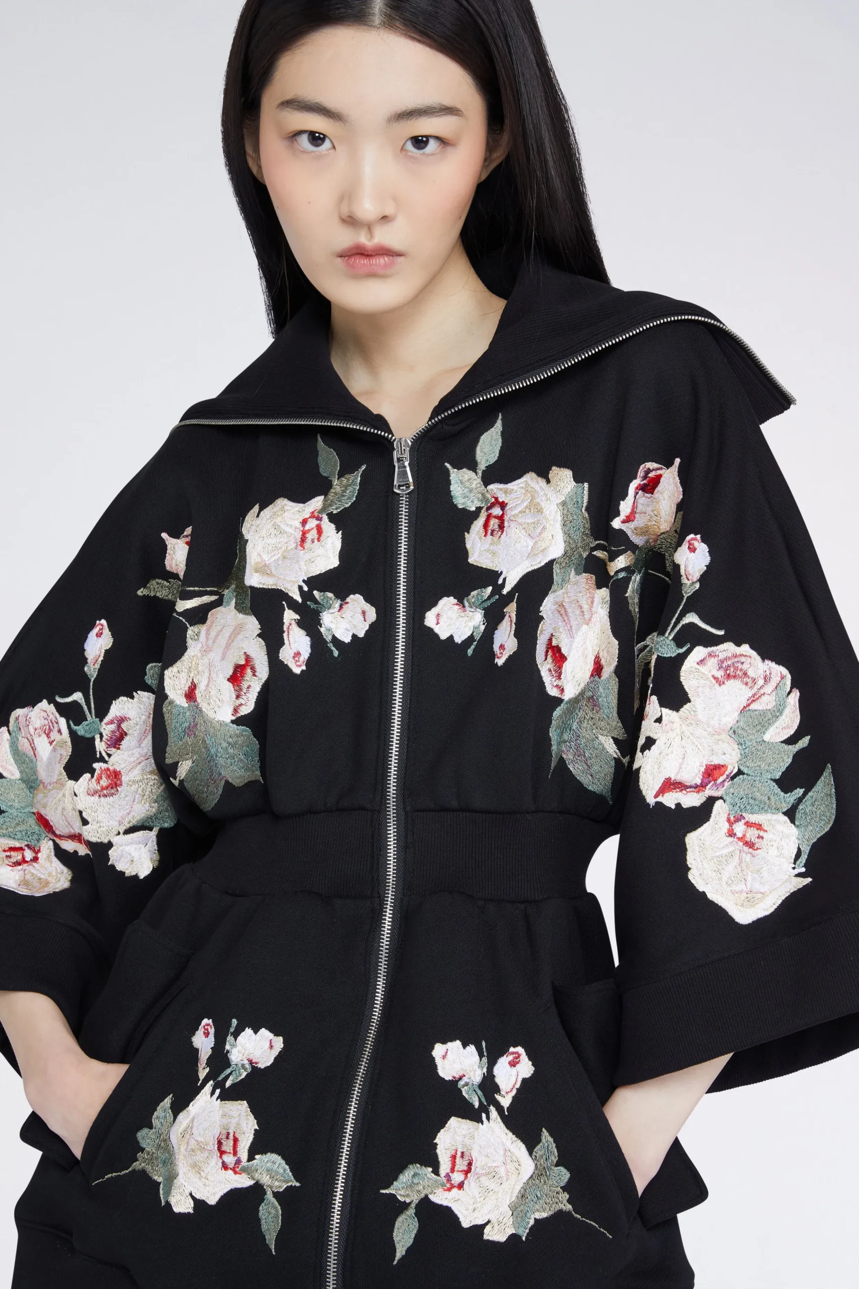 Felpa in 100% cotone con zip, maniche ampie stile kimono e patchwork floreali realizzati artigianalmente.