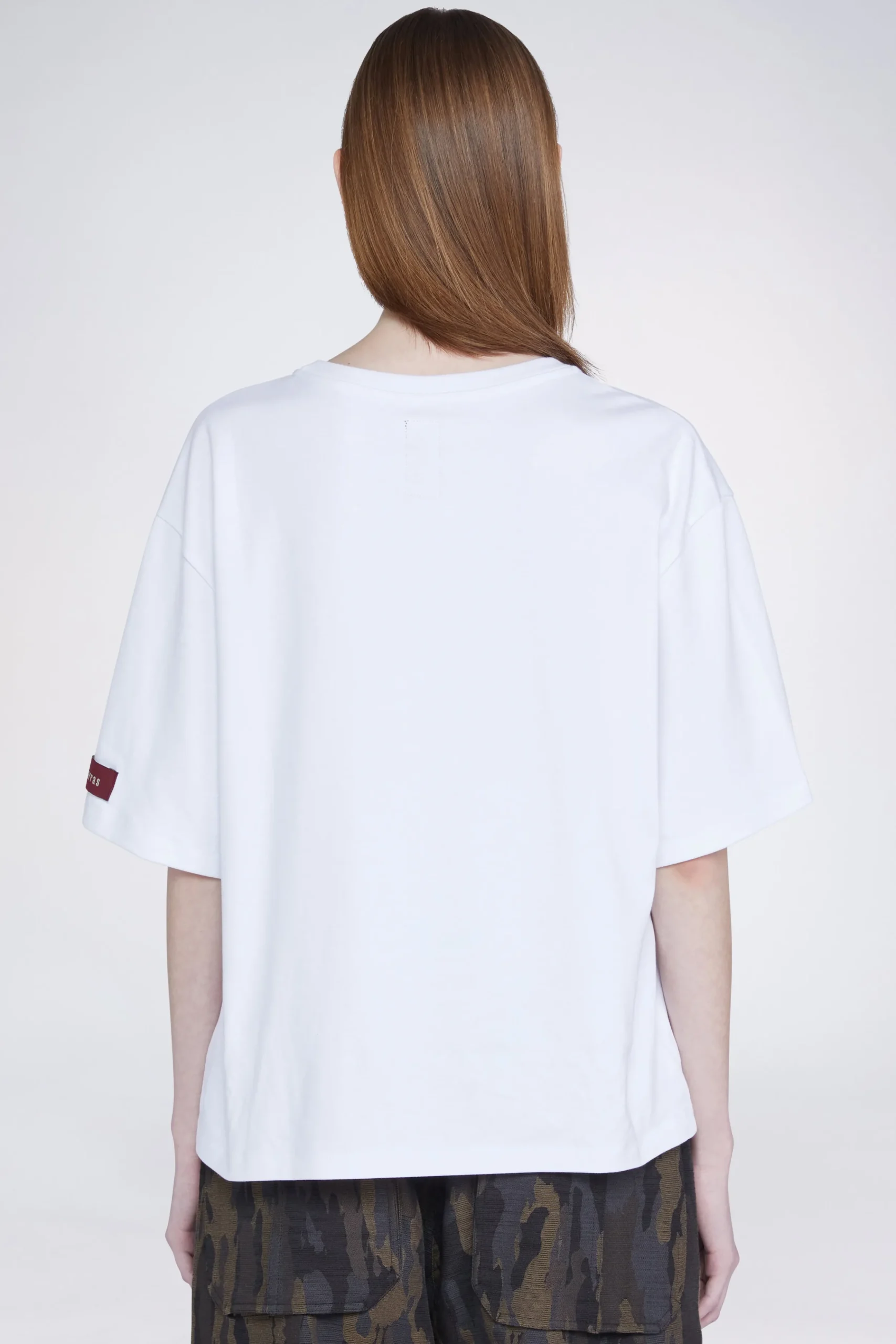 T-shirt bianca unisex realizzata in cotone 100% con stampa di un cuore sul petto.