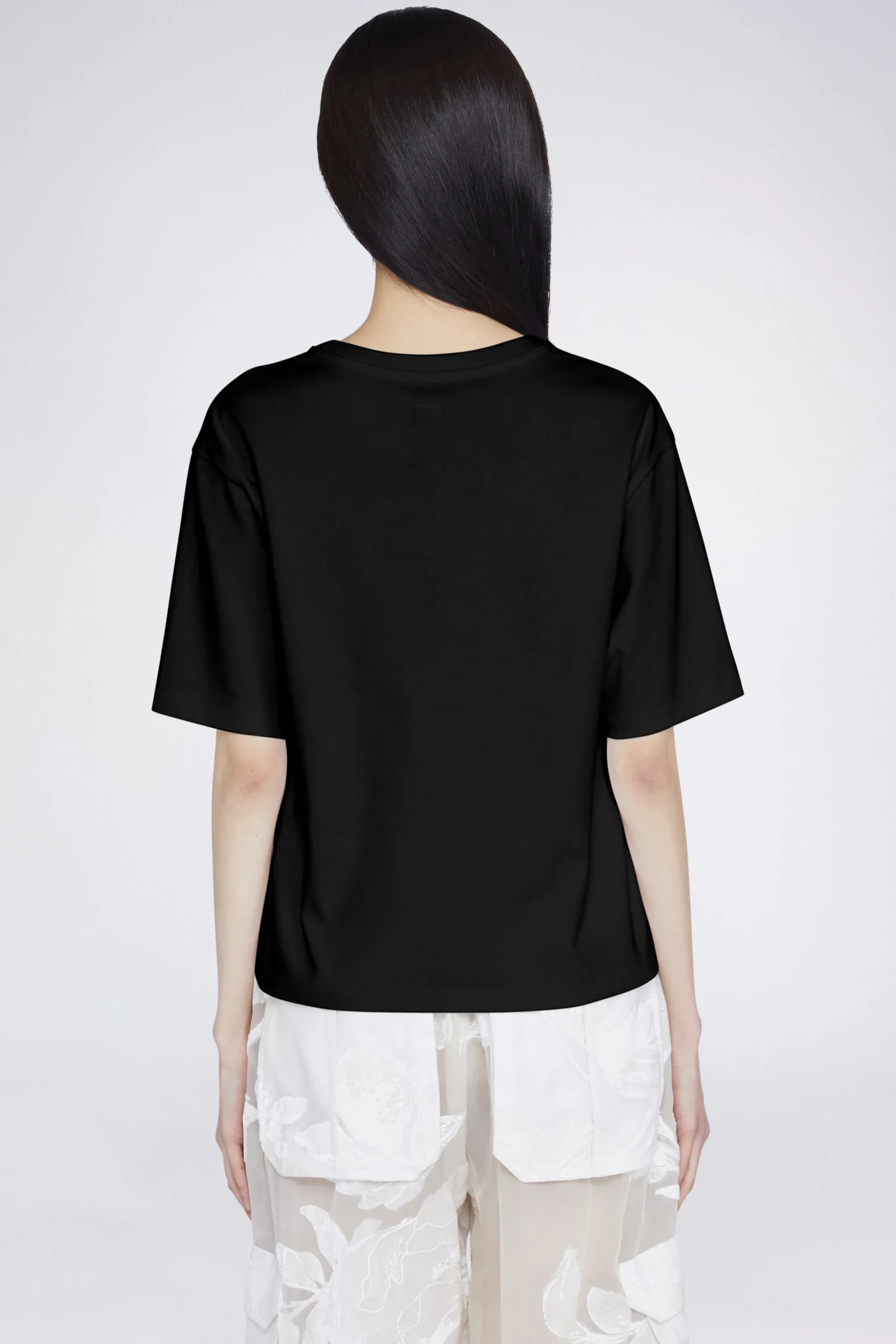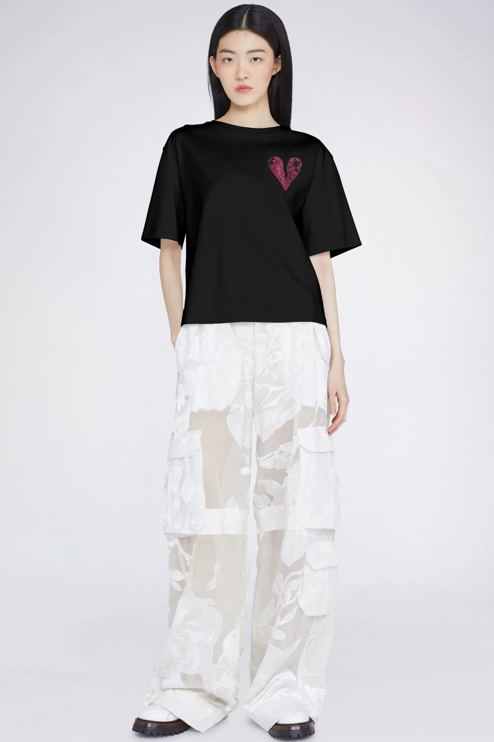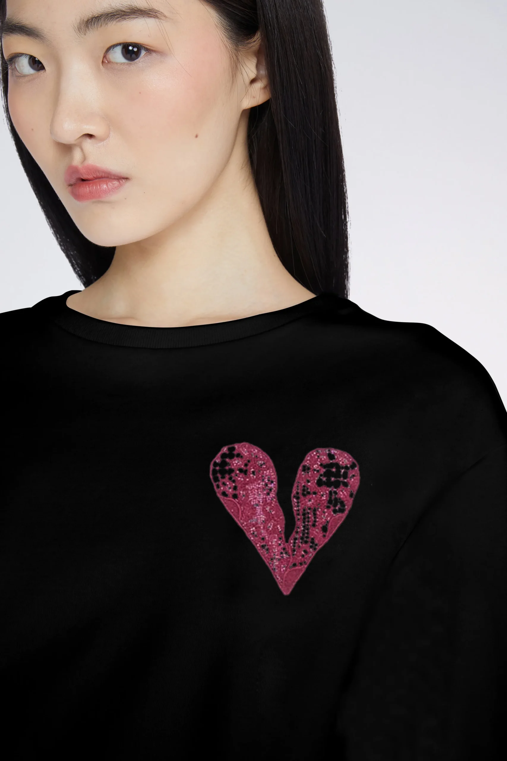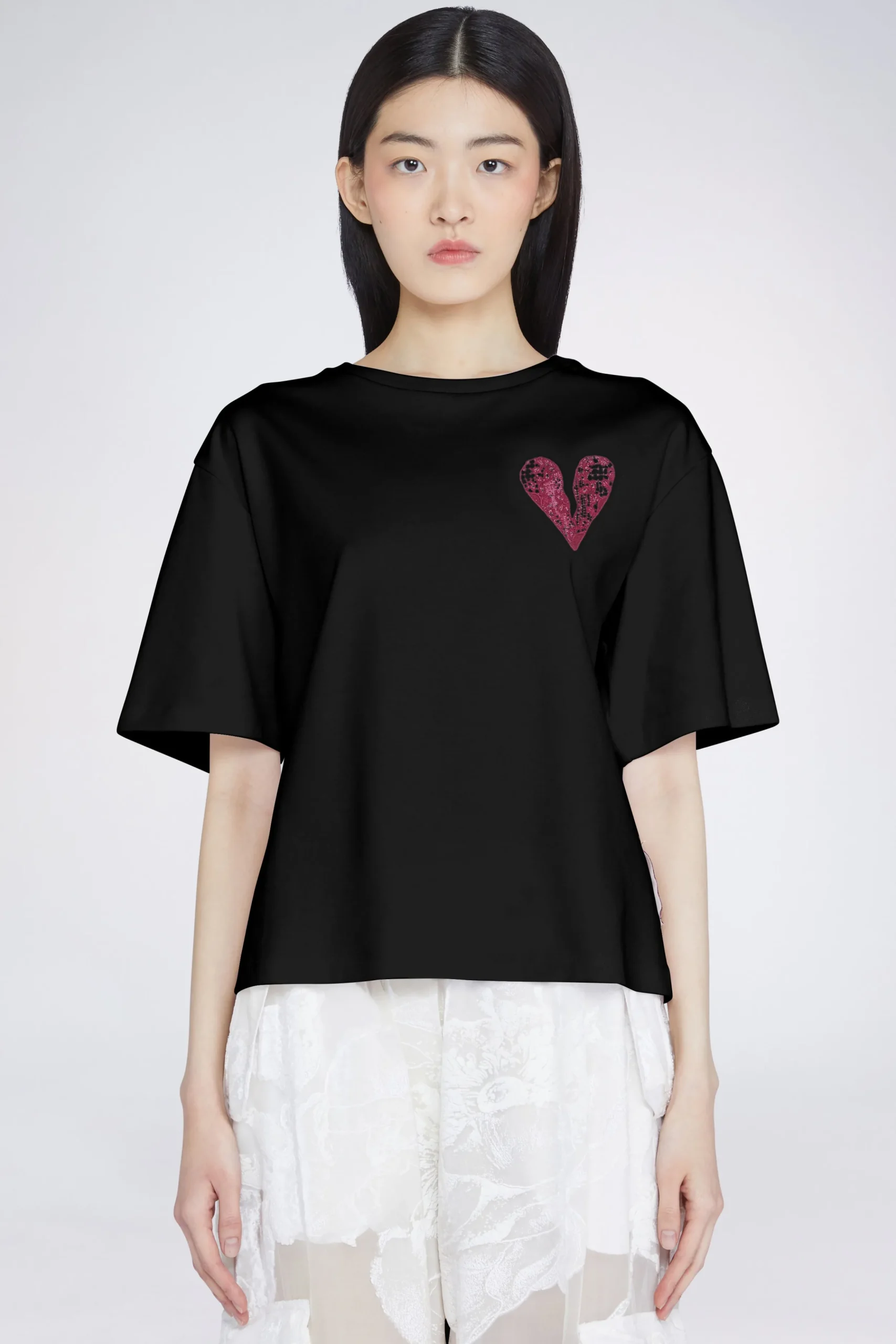 T-shirt nera unisex realizzata in cotone 100% con stampa di un cuore sul petto.