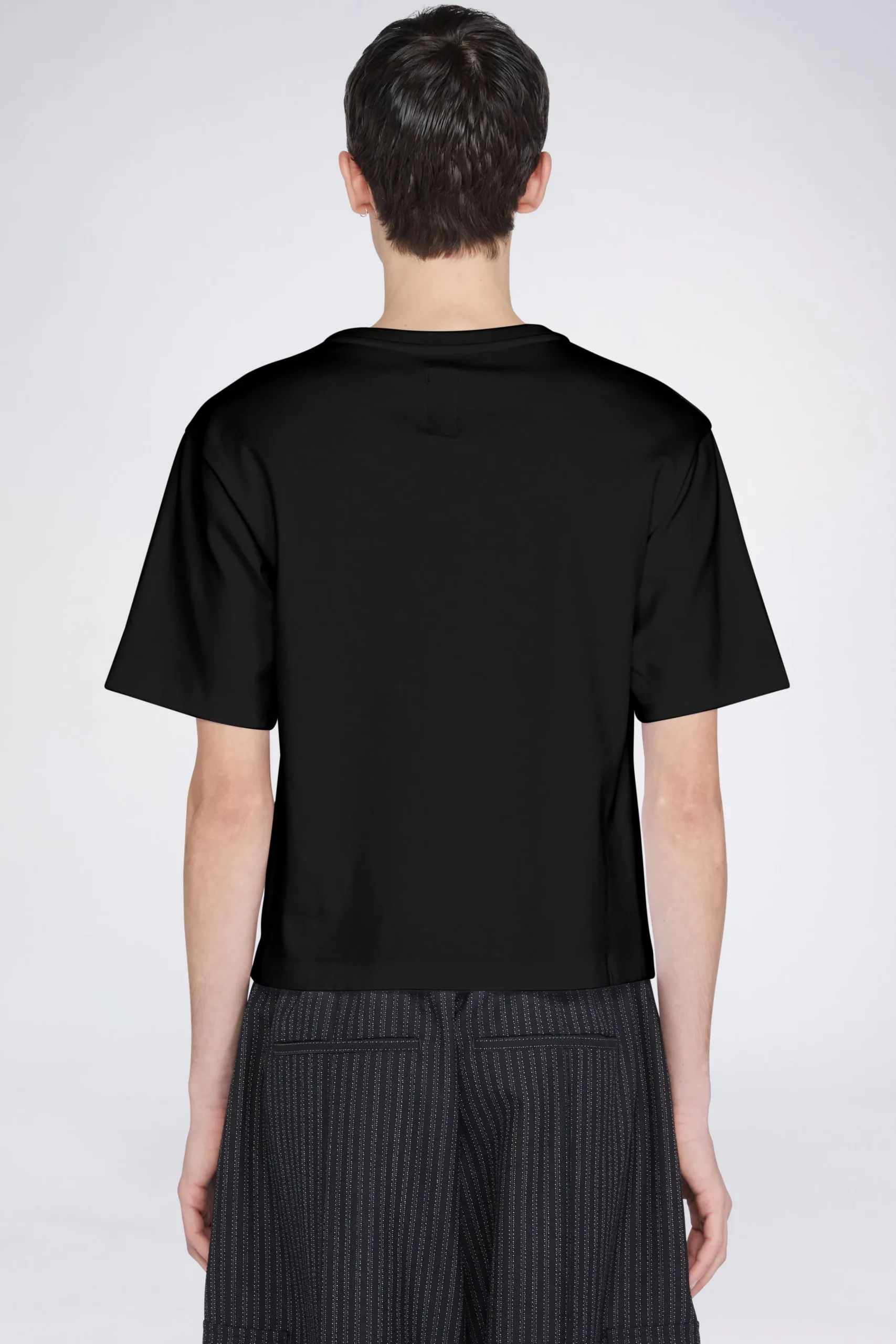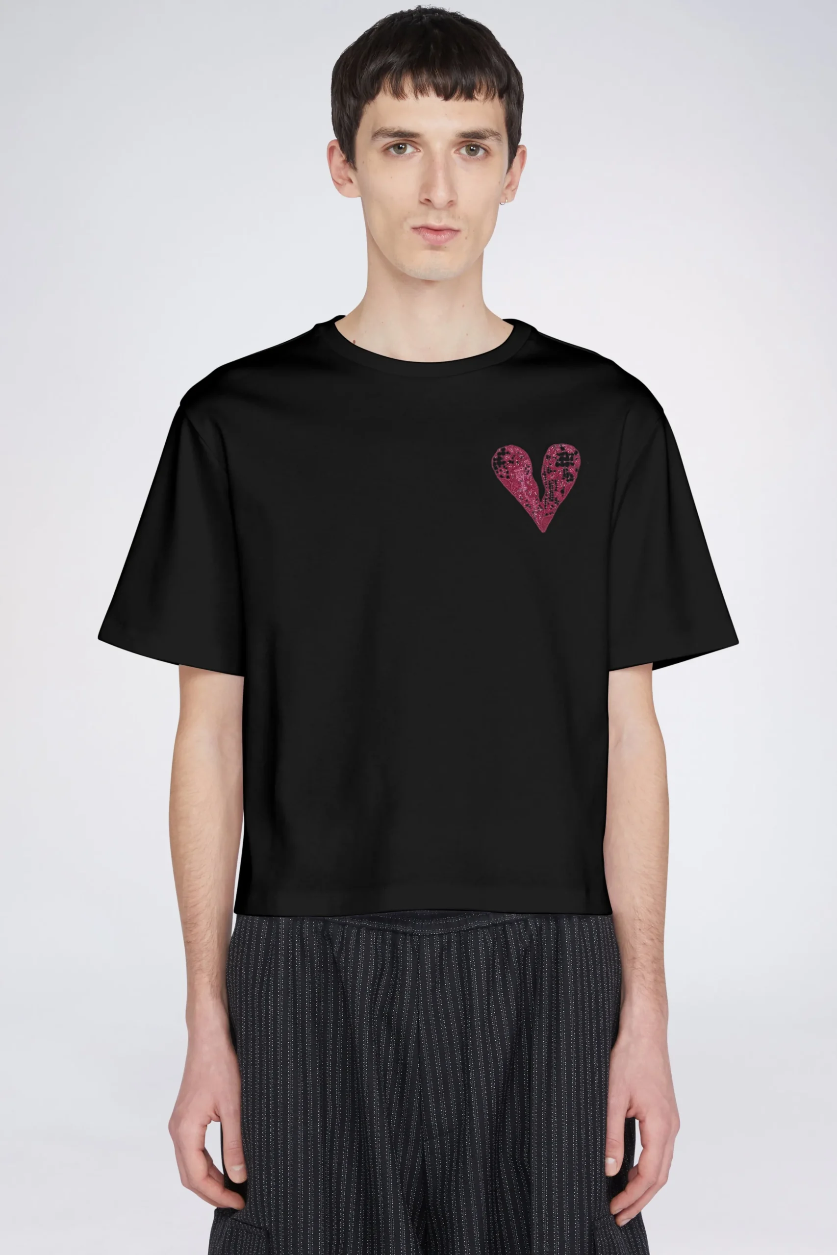 T-shirt nera unisex realizzata in cotone 100% con stampa di un cuore sul petto.