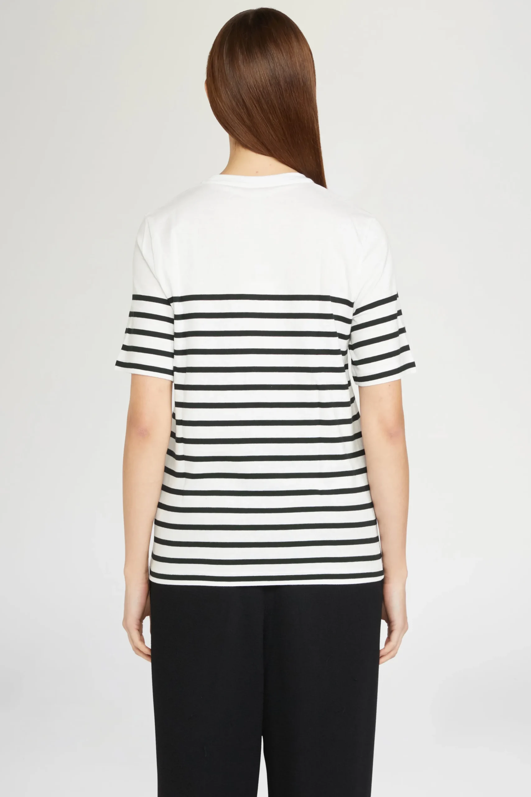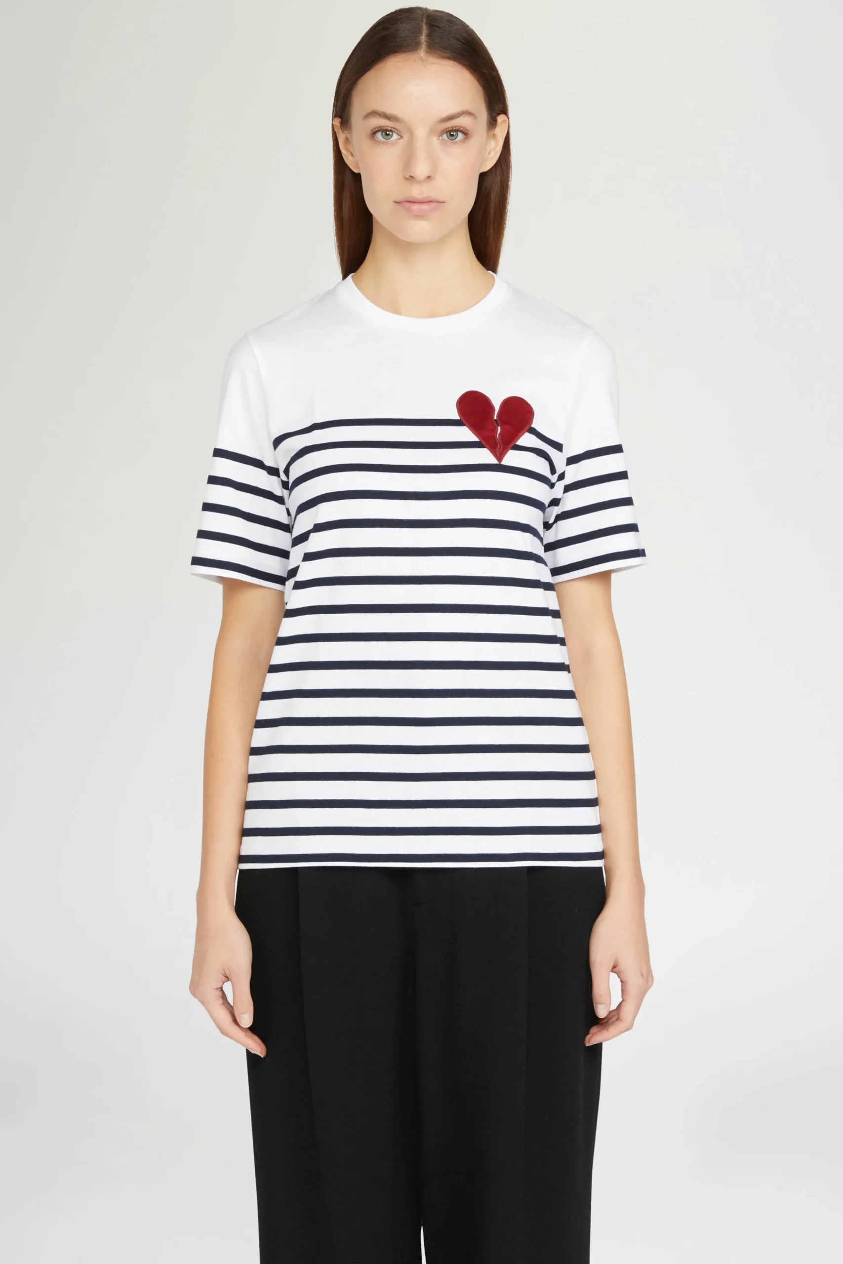 T-shirt unisex realizzata in 100% cotone con righe orizzontali e applicazione cuore spezzato.