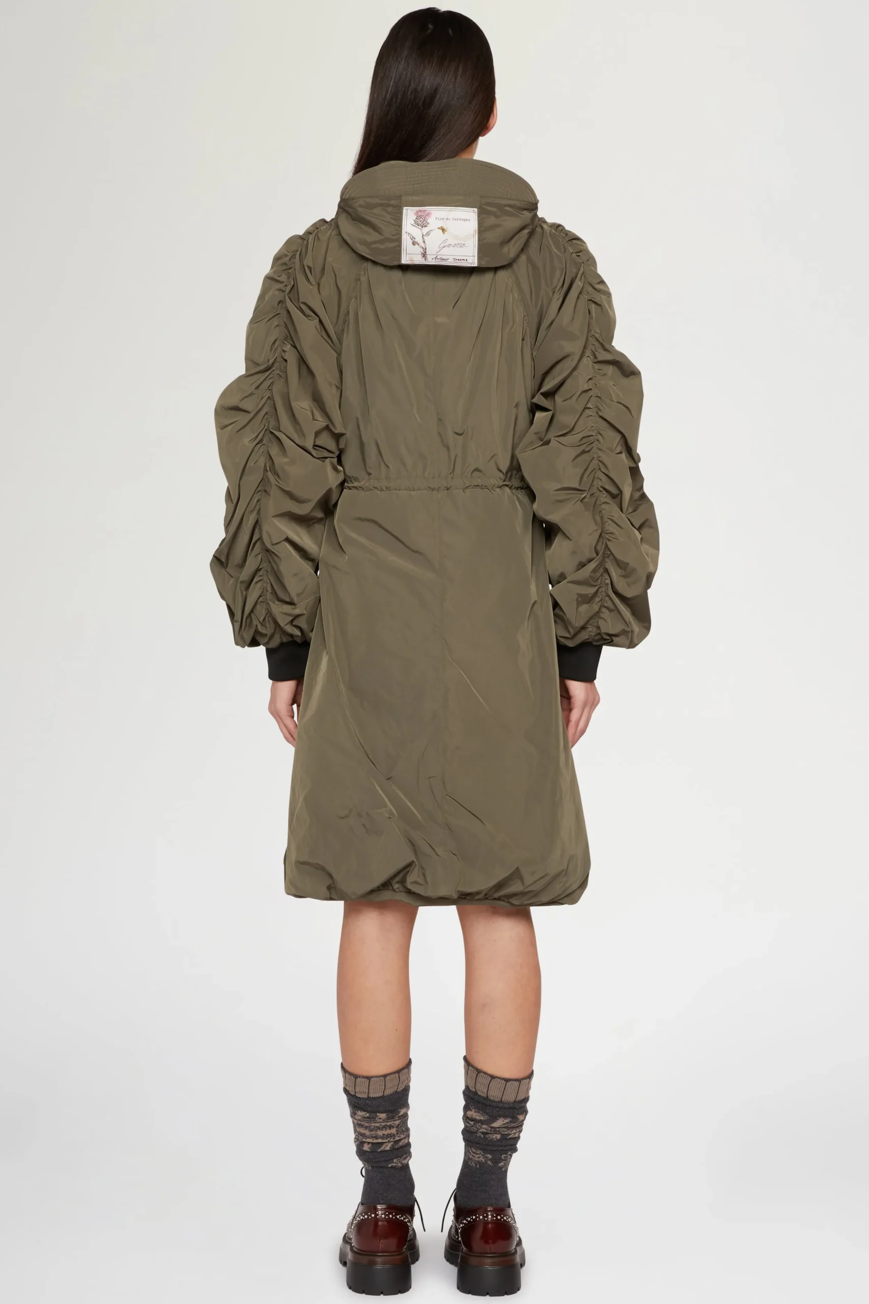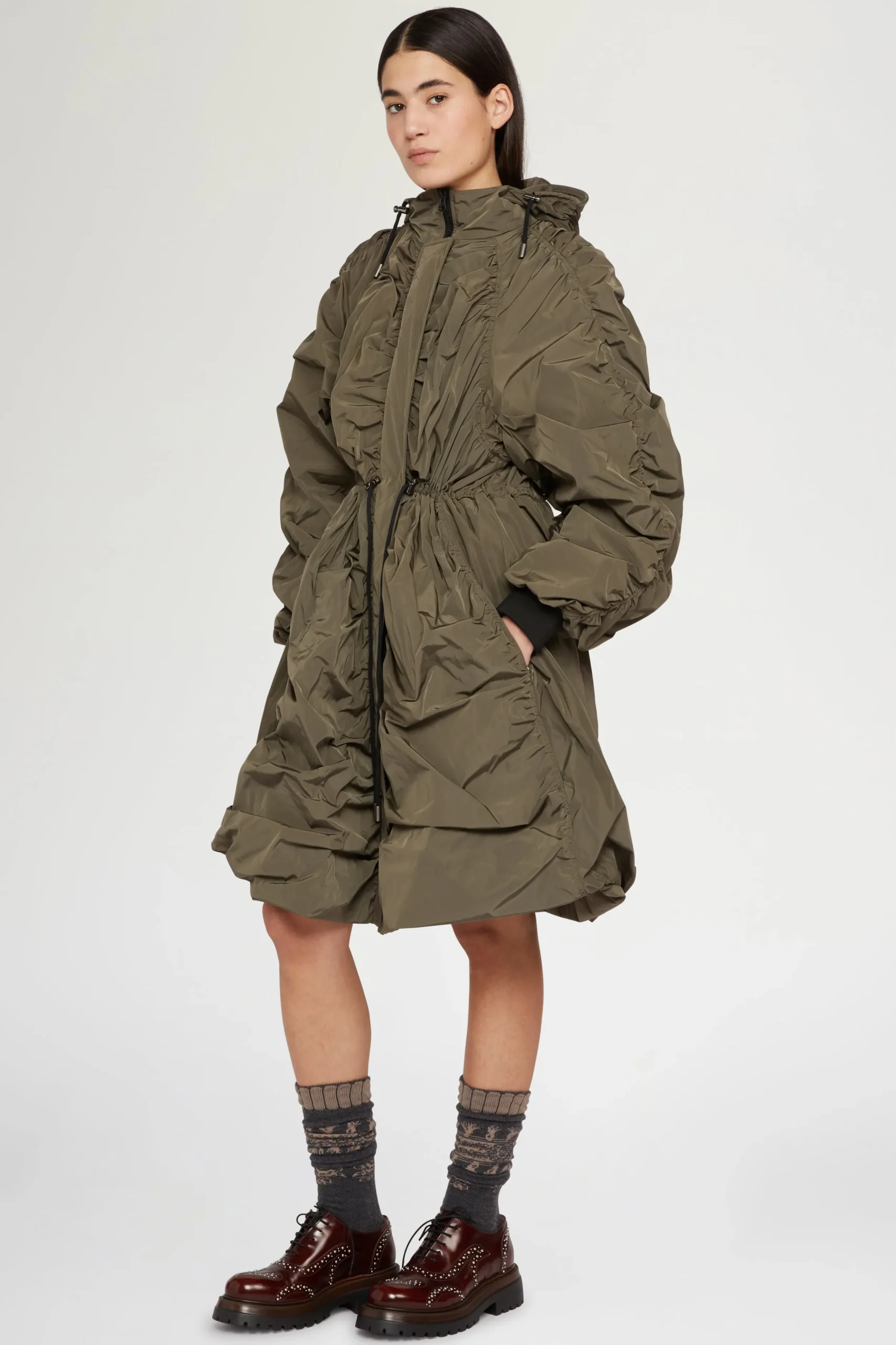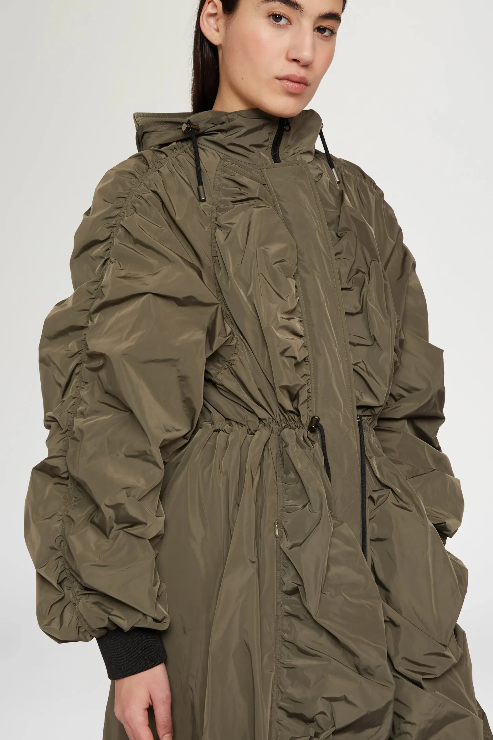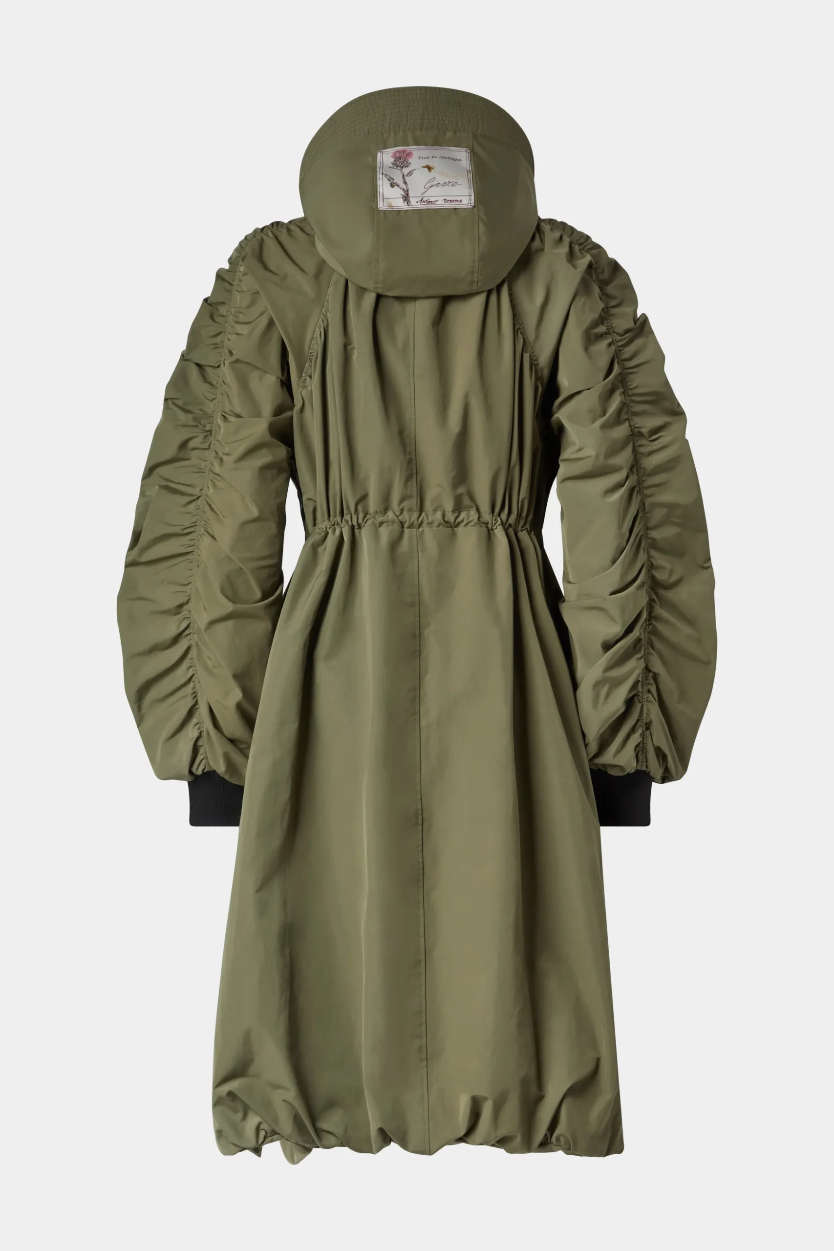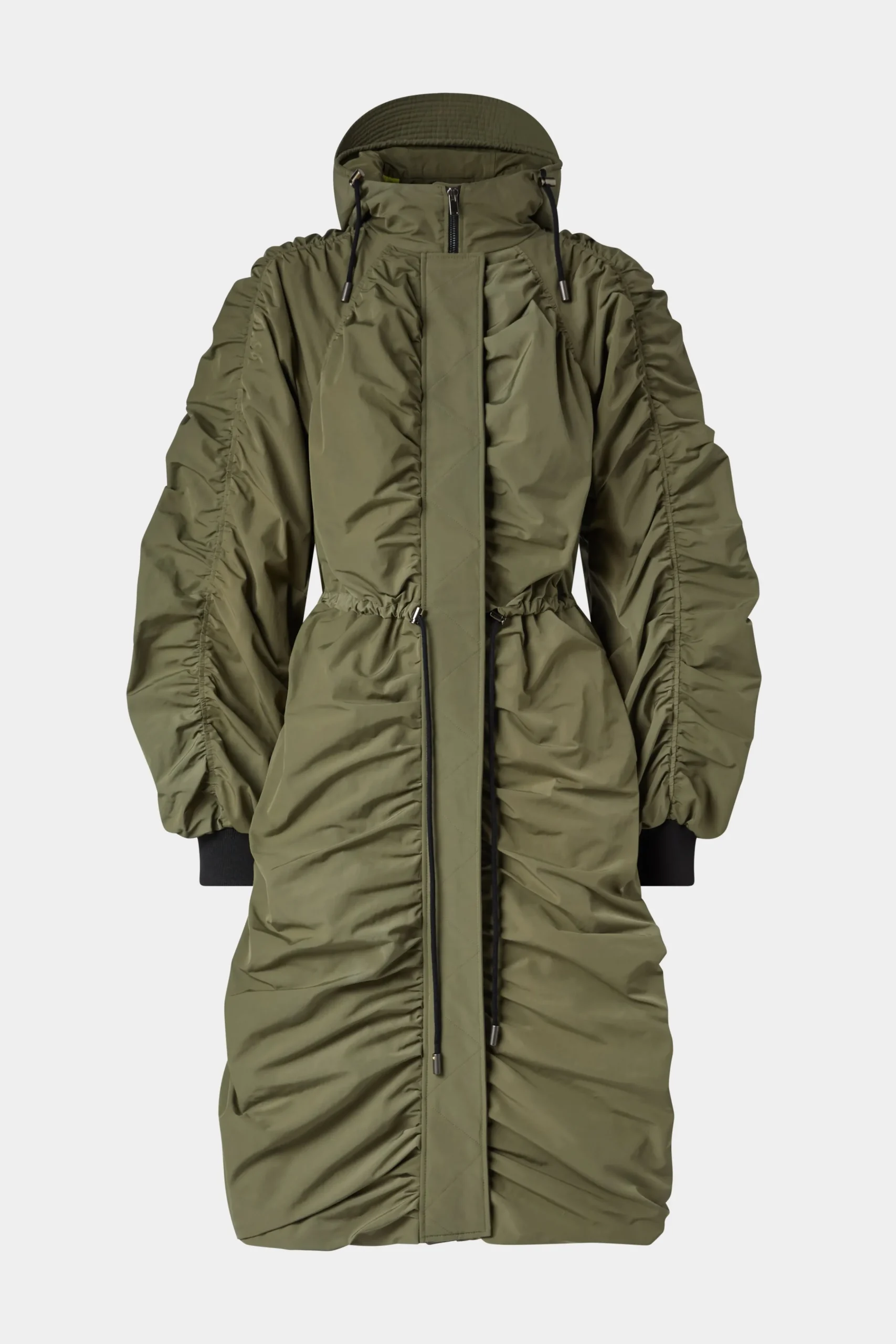 Impermeabile con design arricciato, vita regolabile, collo alto e cappuccio per uno stile audace ma funzionale.