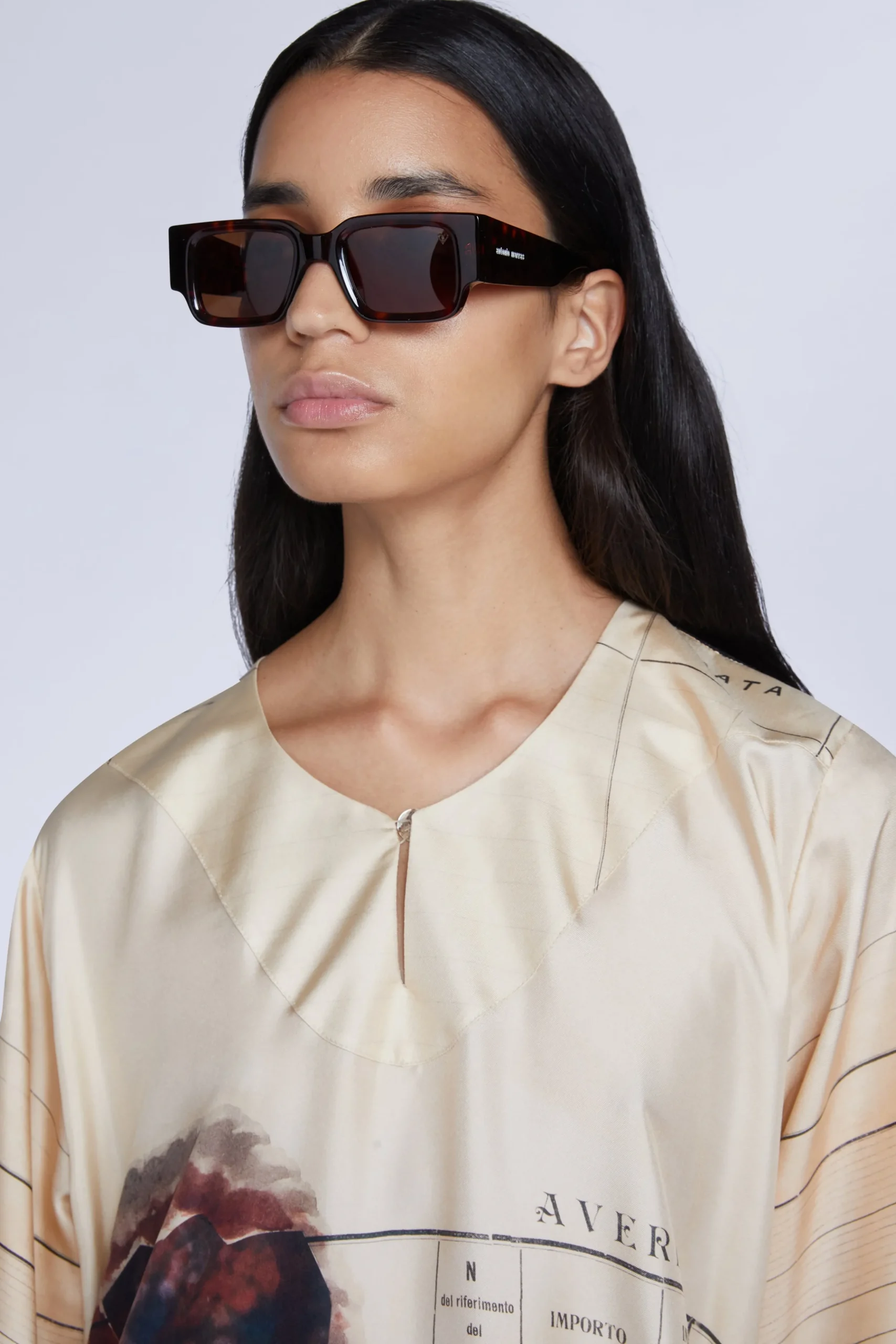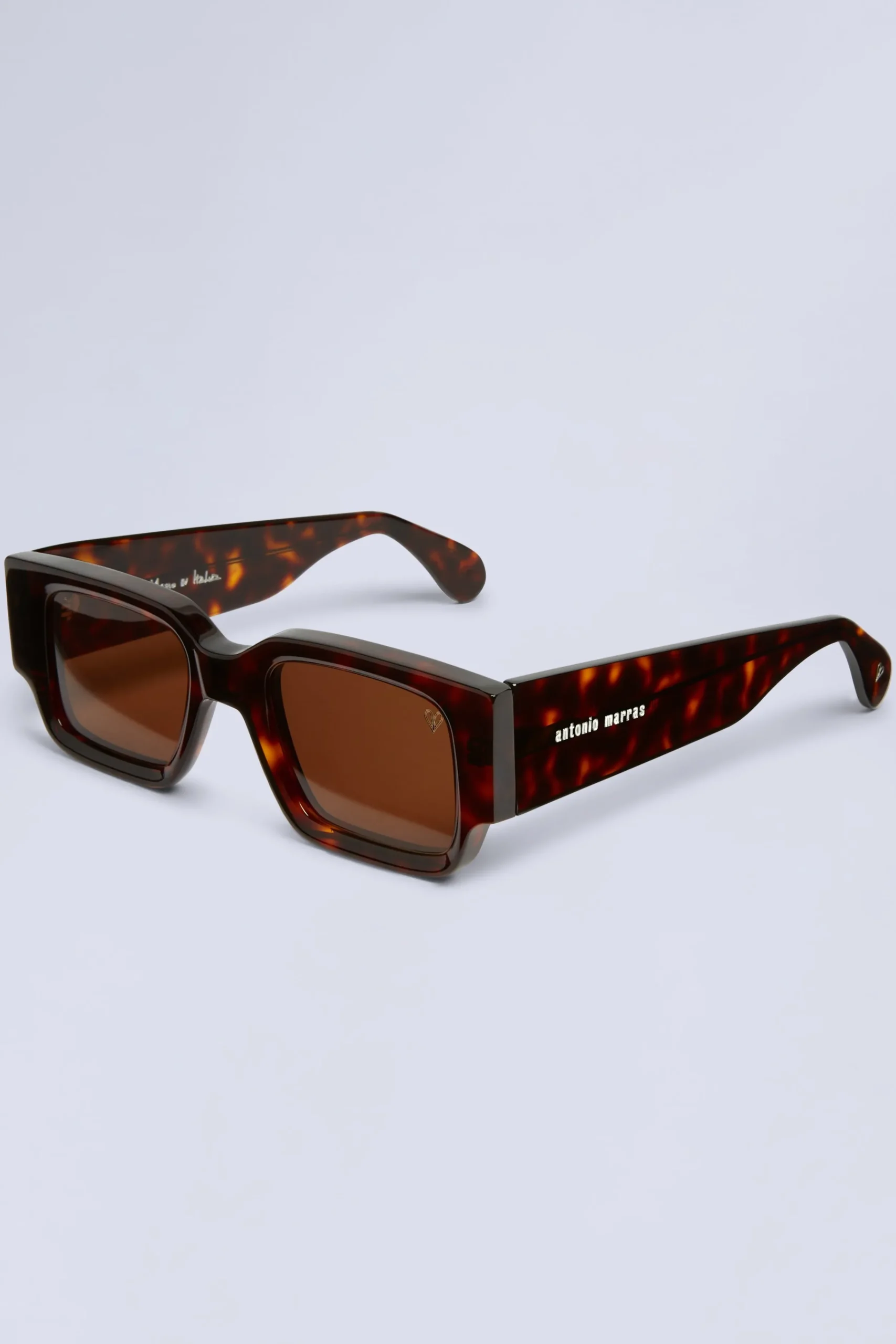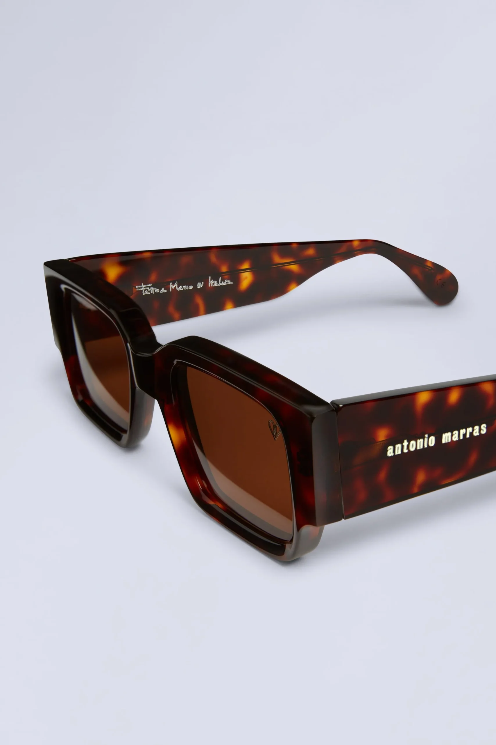 Occhiali da sole con montatura quadrata tartarugata e lenti marroni.