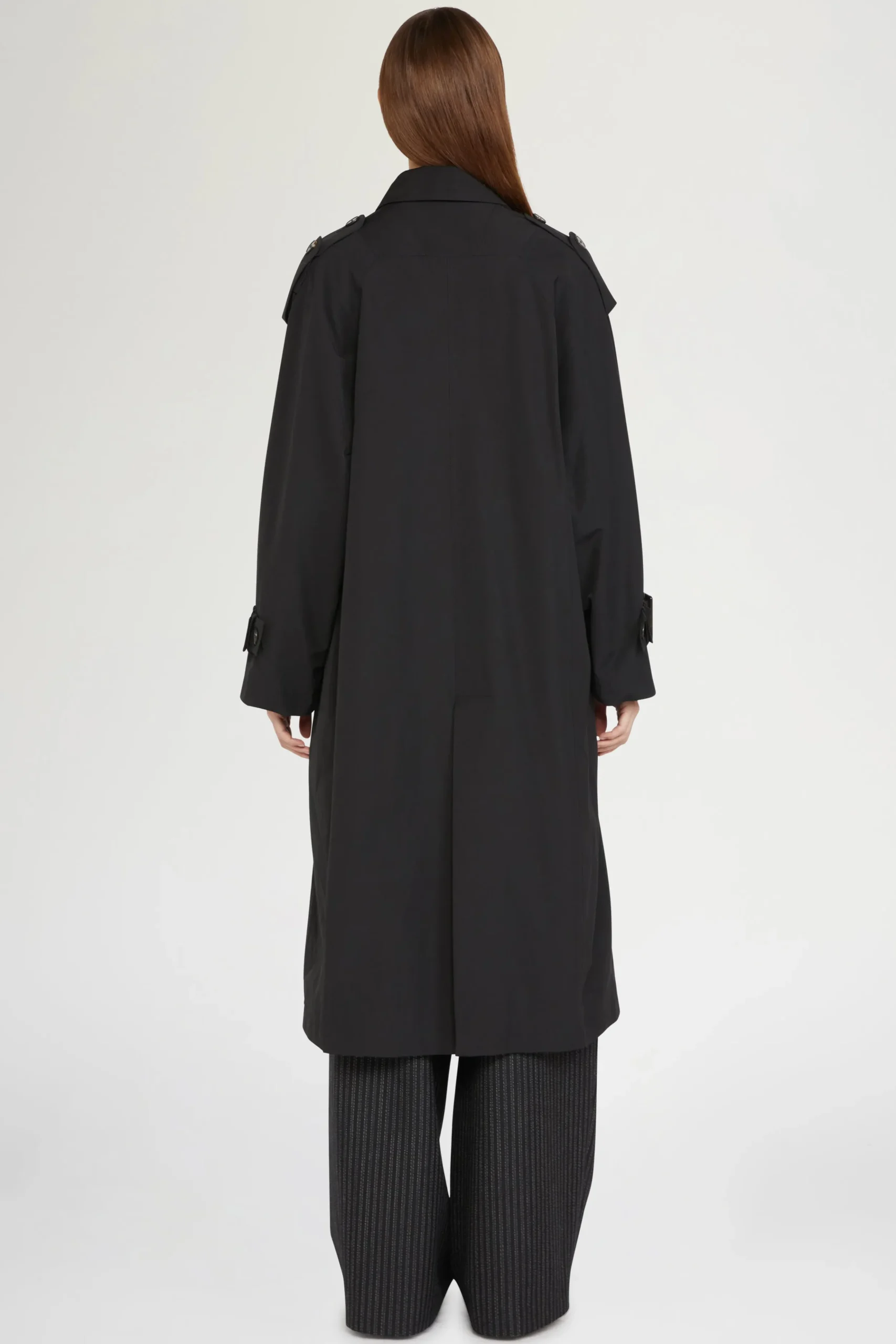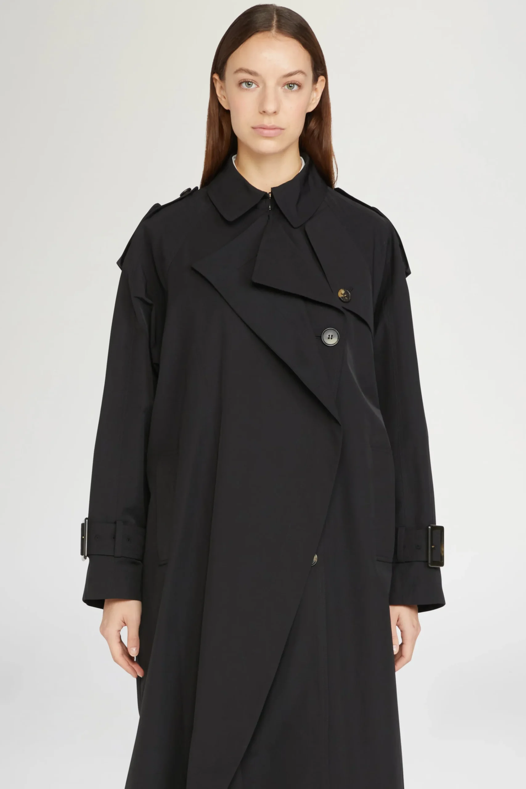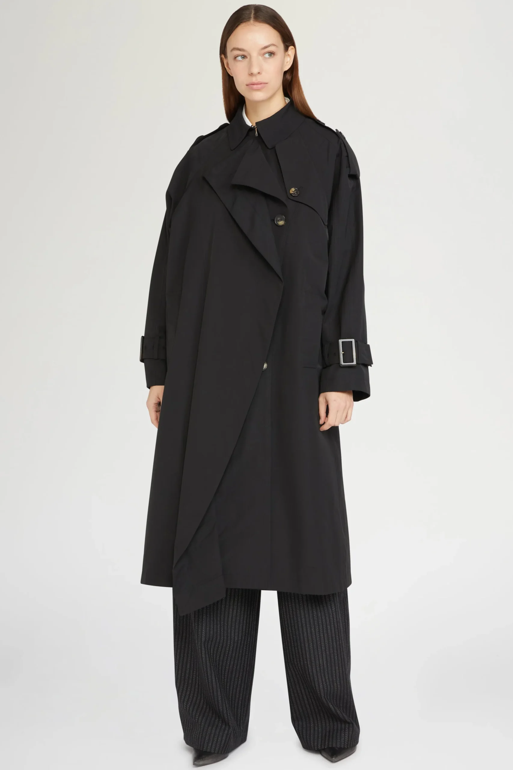 Trench nero con vestibilità oversize, patta antivento asimmetrica, chiusura con bottoni e polsini con cintura.