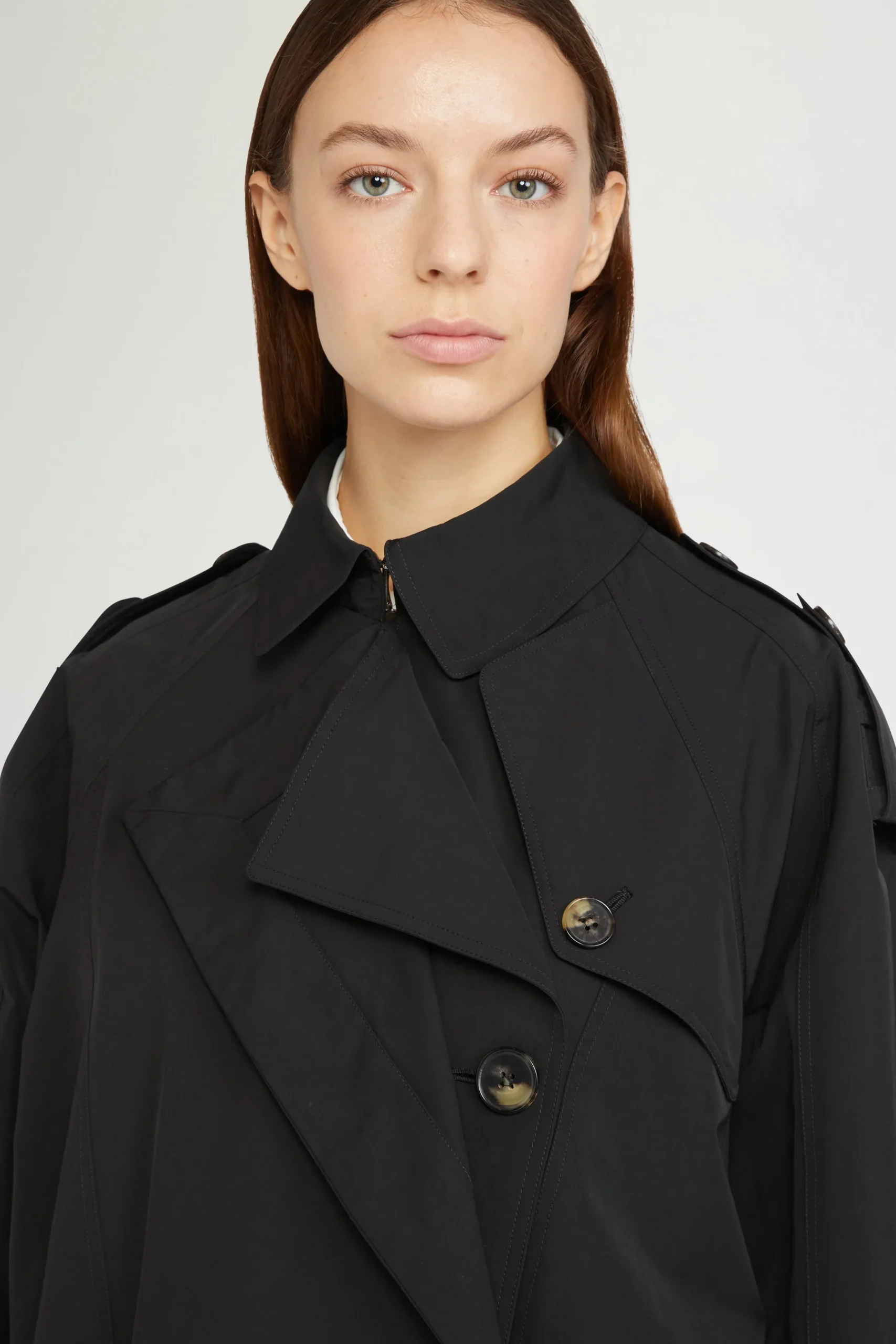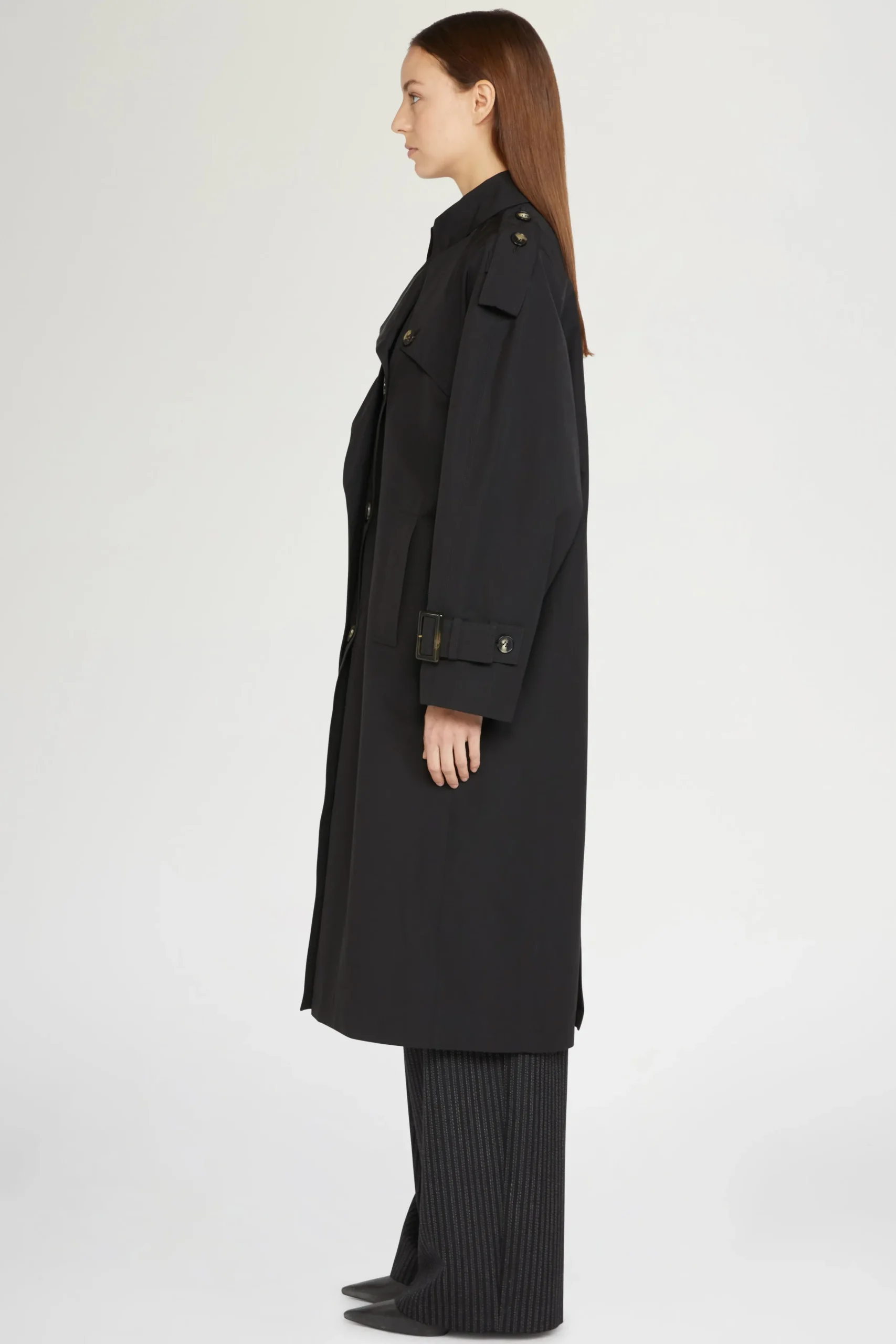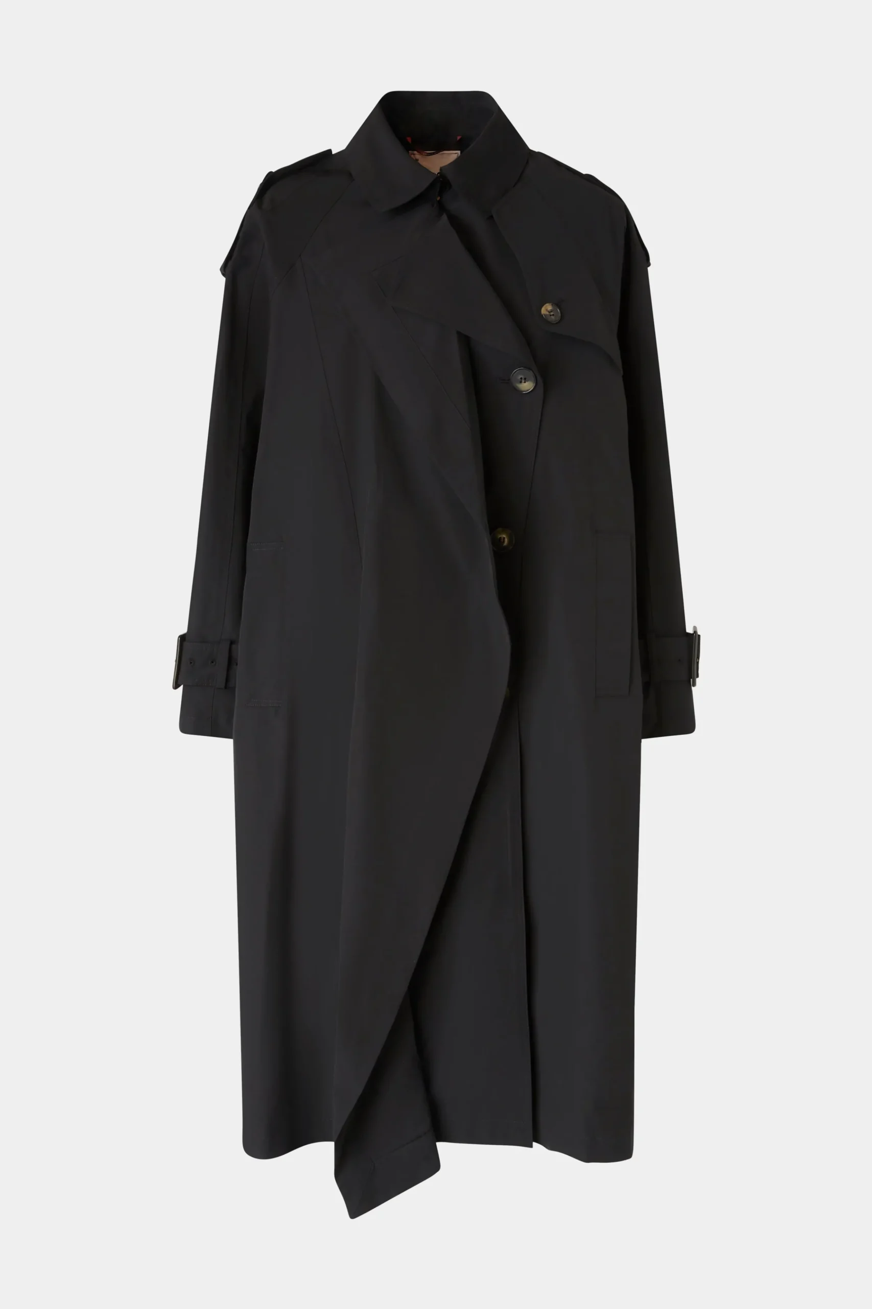 Trench nero con vestibilità oversize, patta antivento asimmetrica, chiusura con bottoni e polsini con cintura.