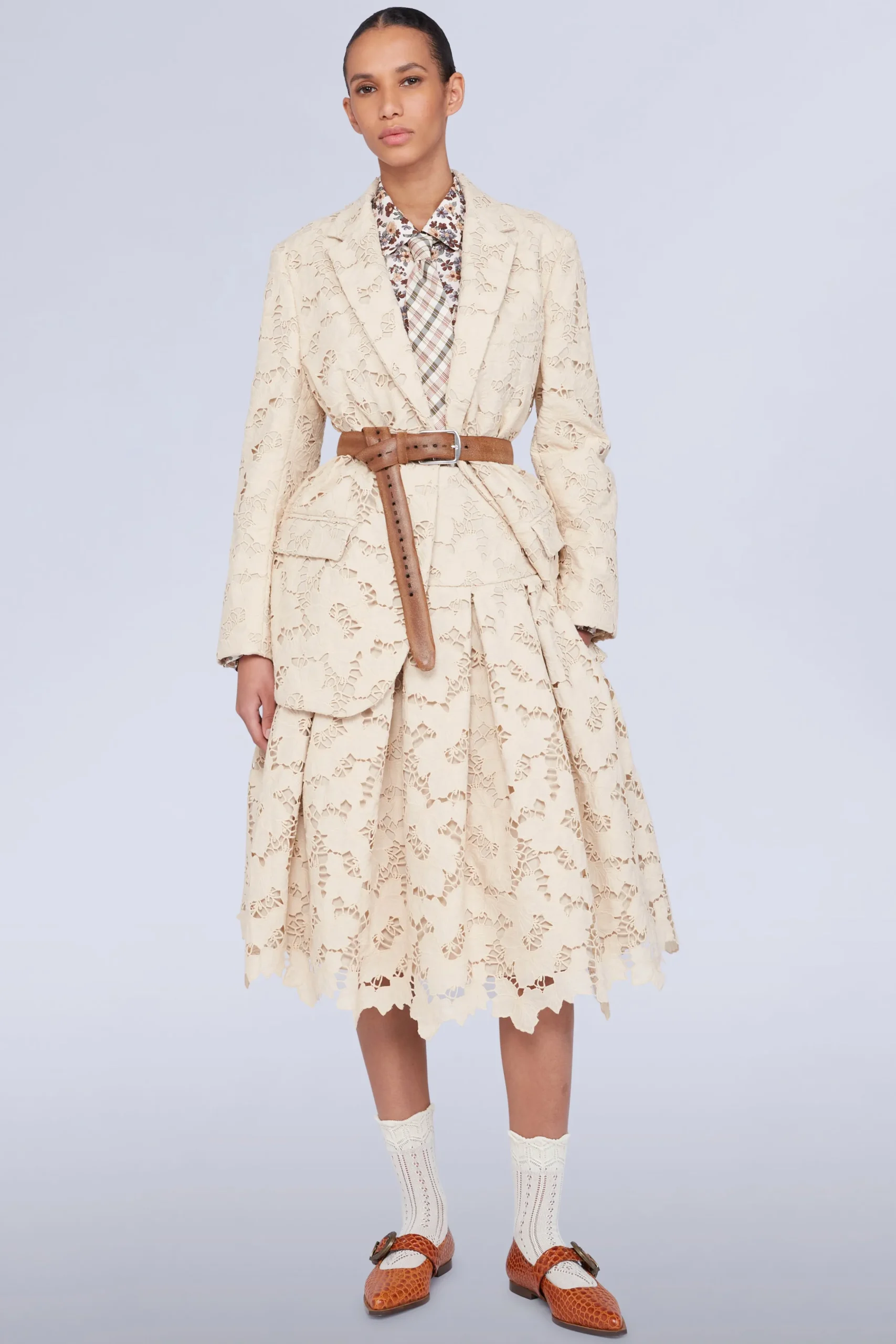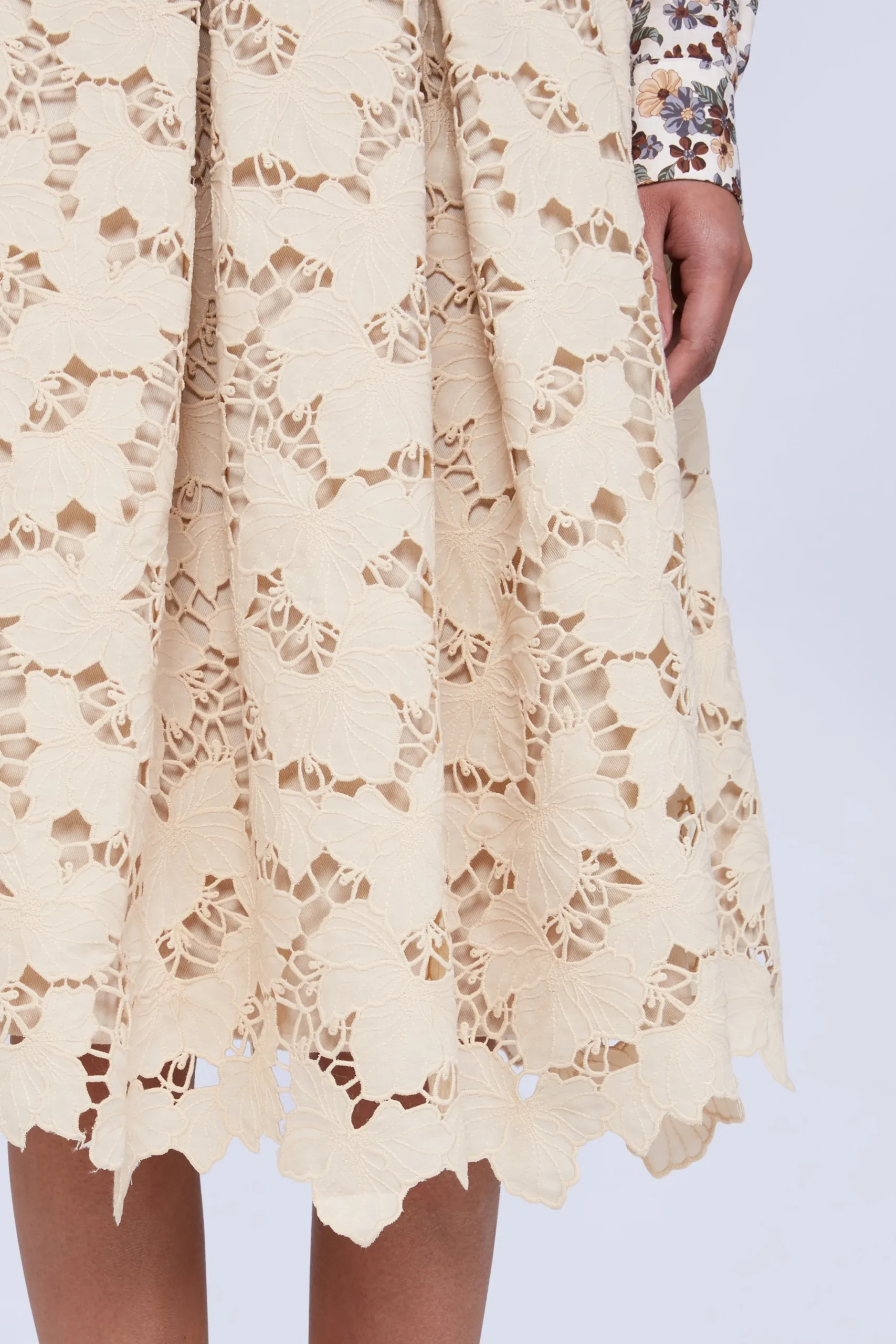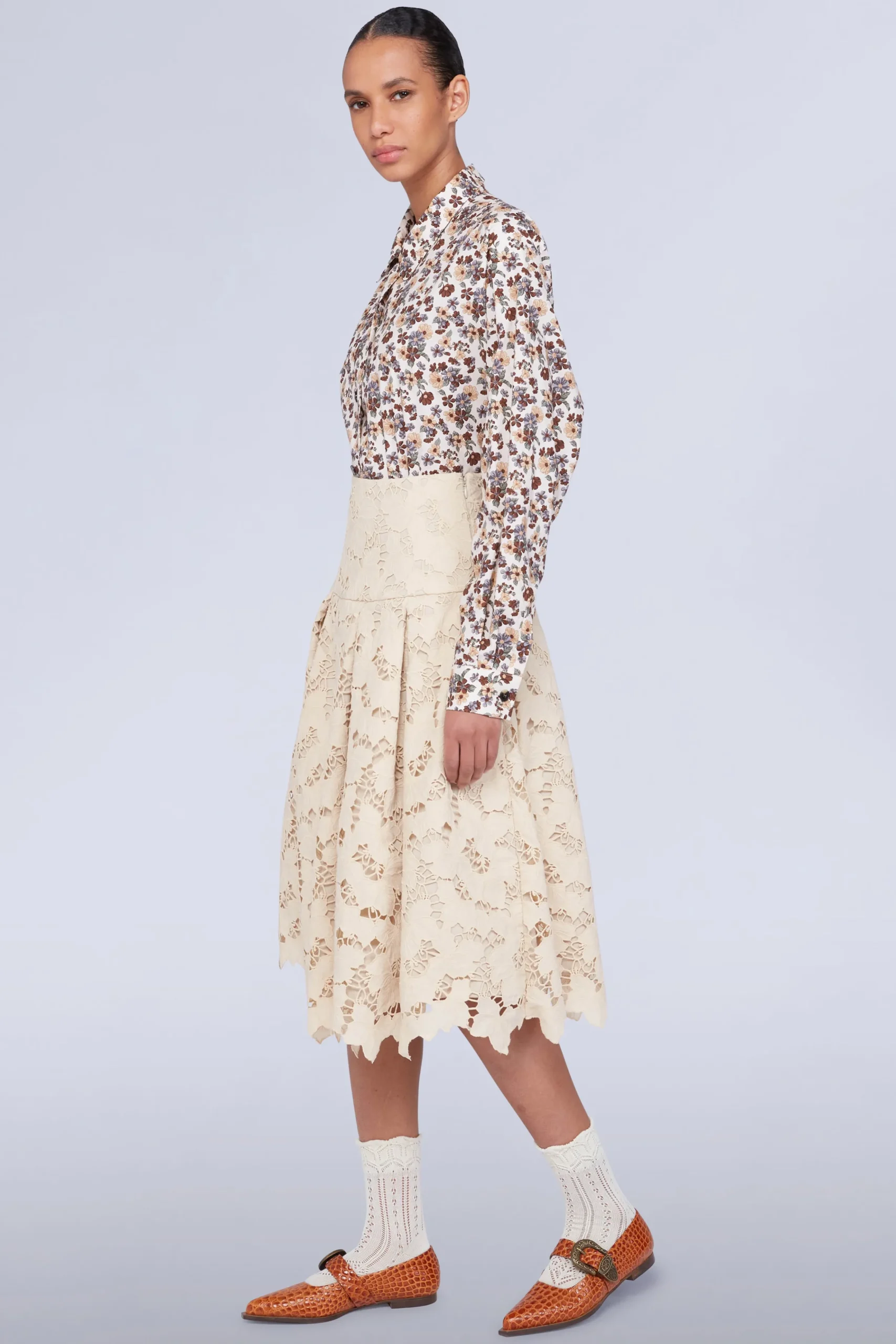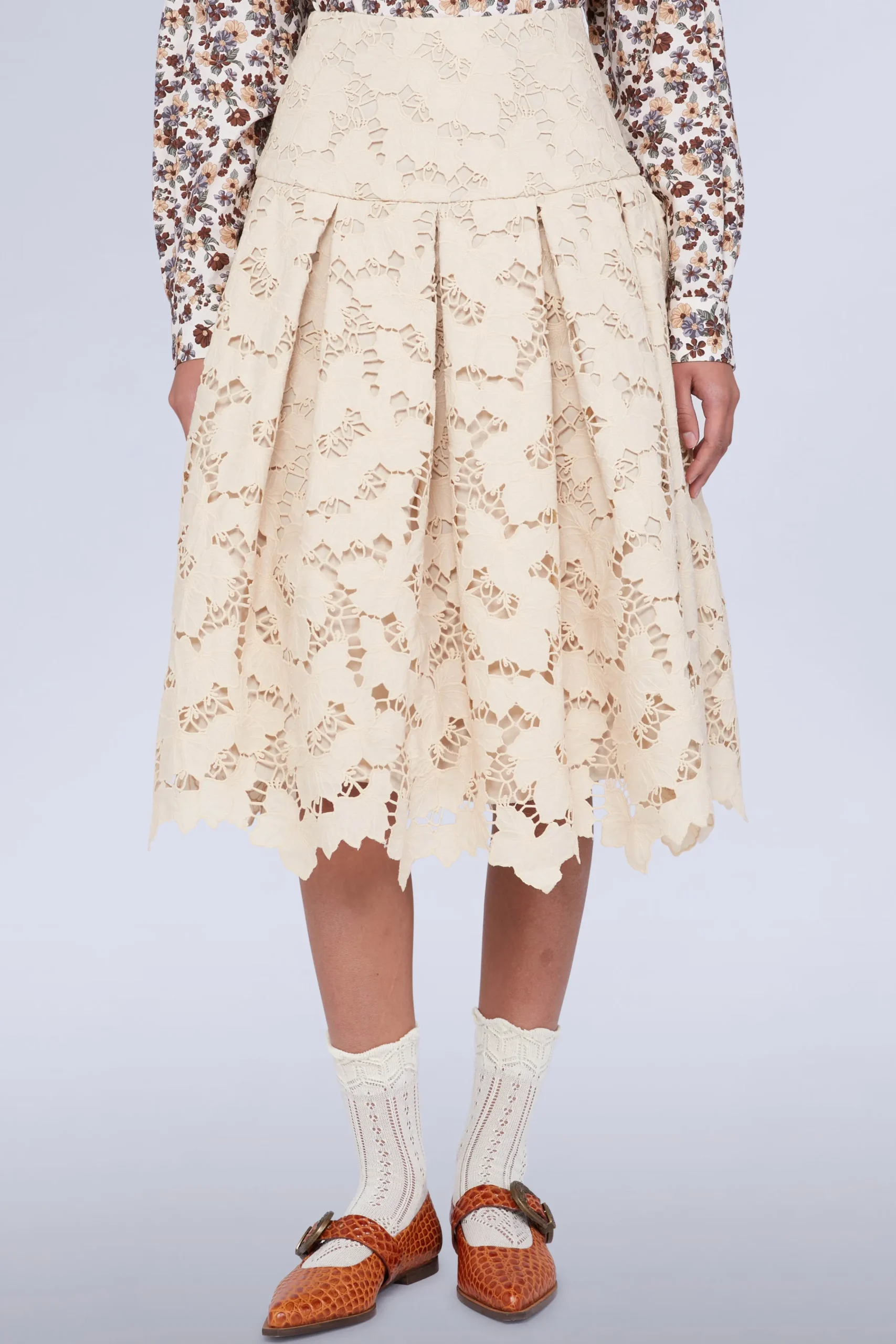 Gonna midi a vita alta realizzata in pizzo con morbide pieghe e tasche laterali.