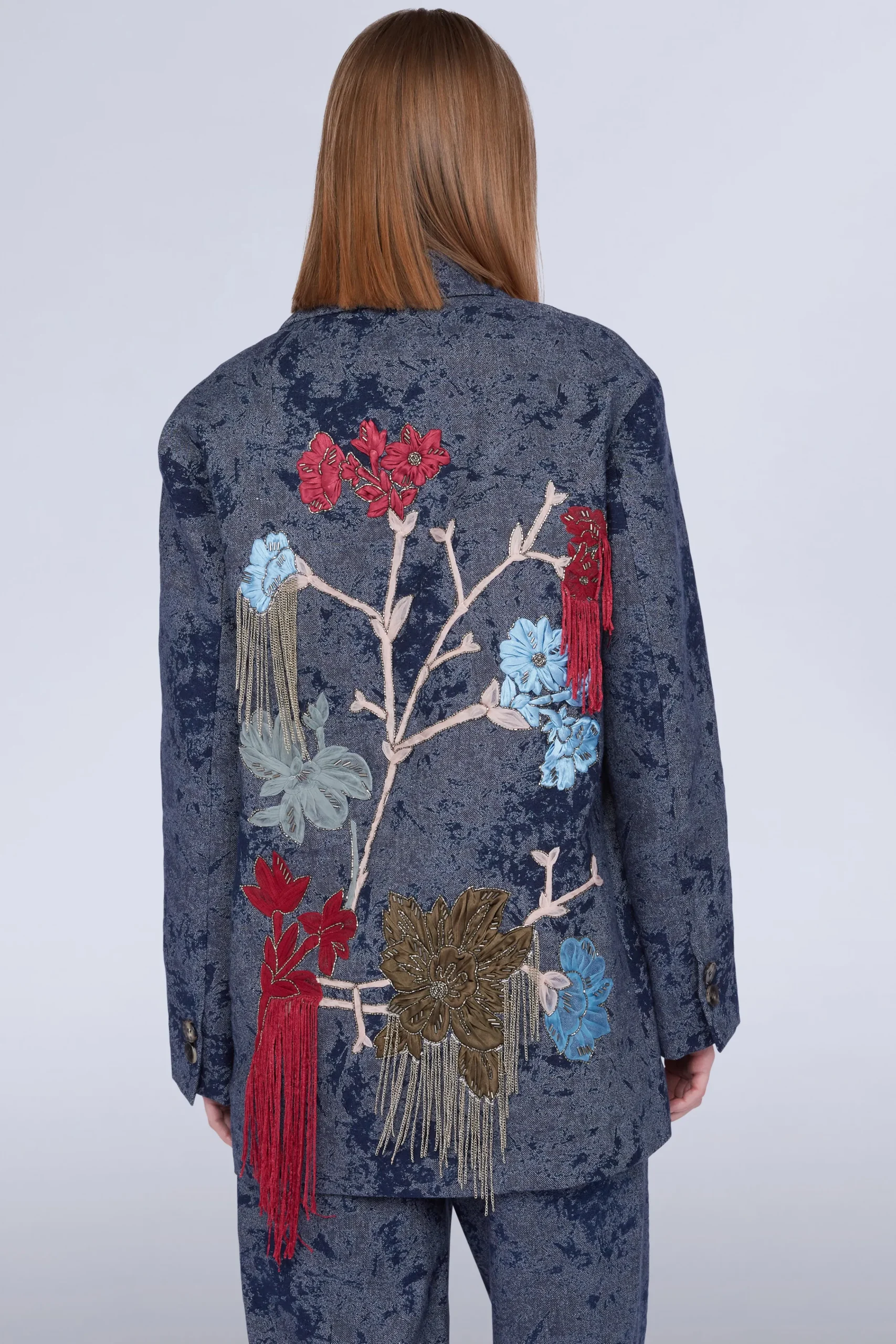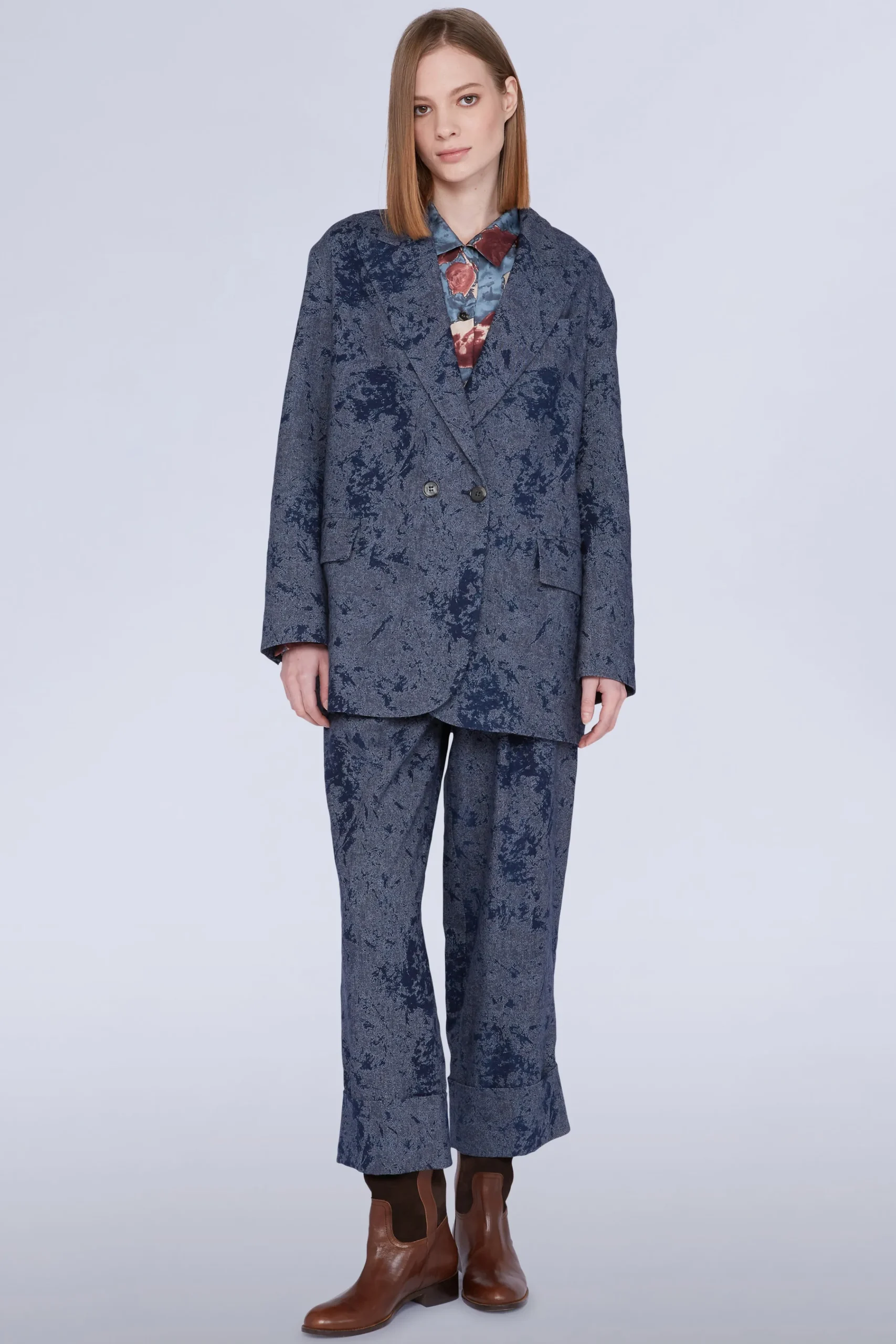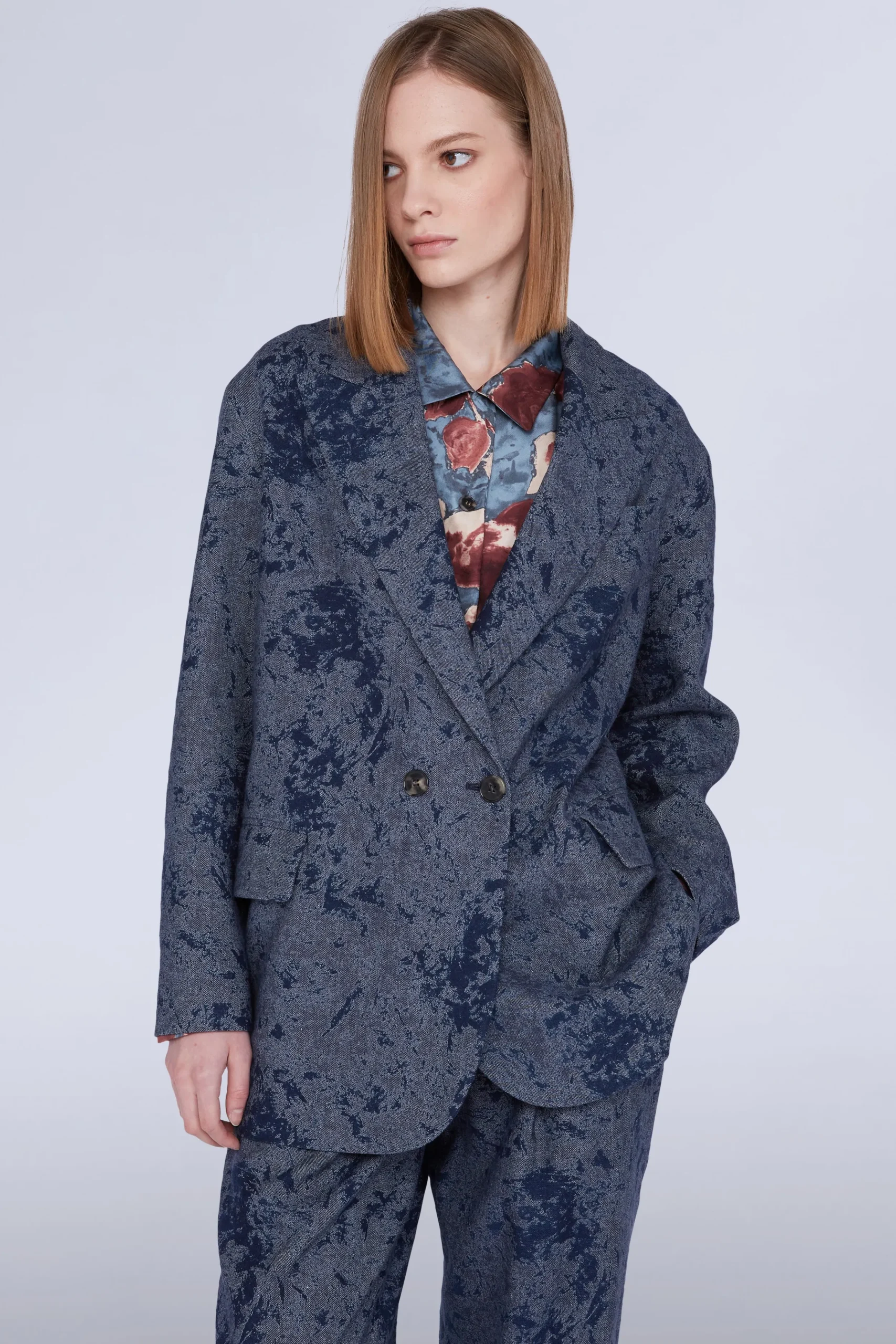 Giacca blu a un petto con bottoni e tasche laterali.