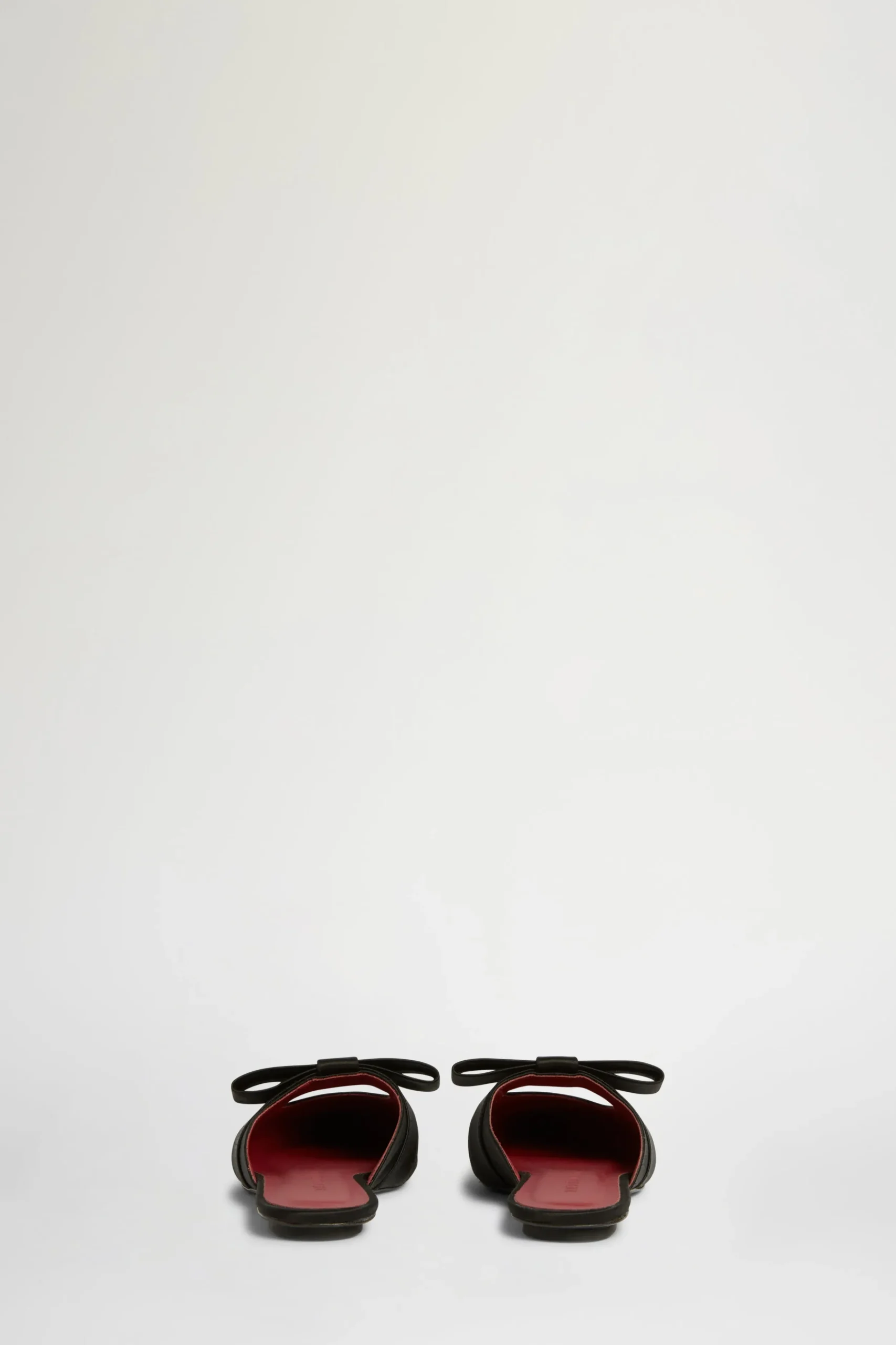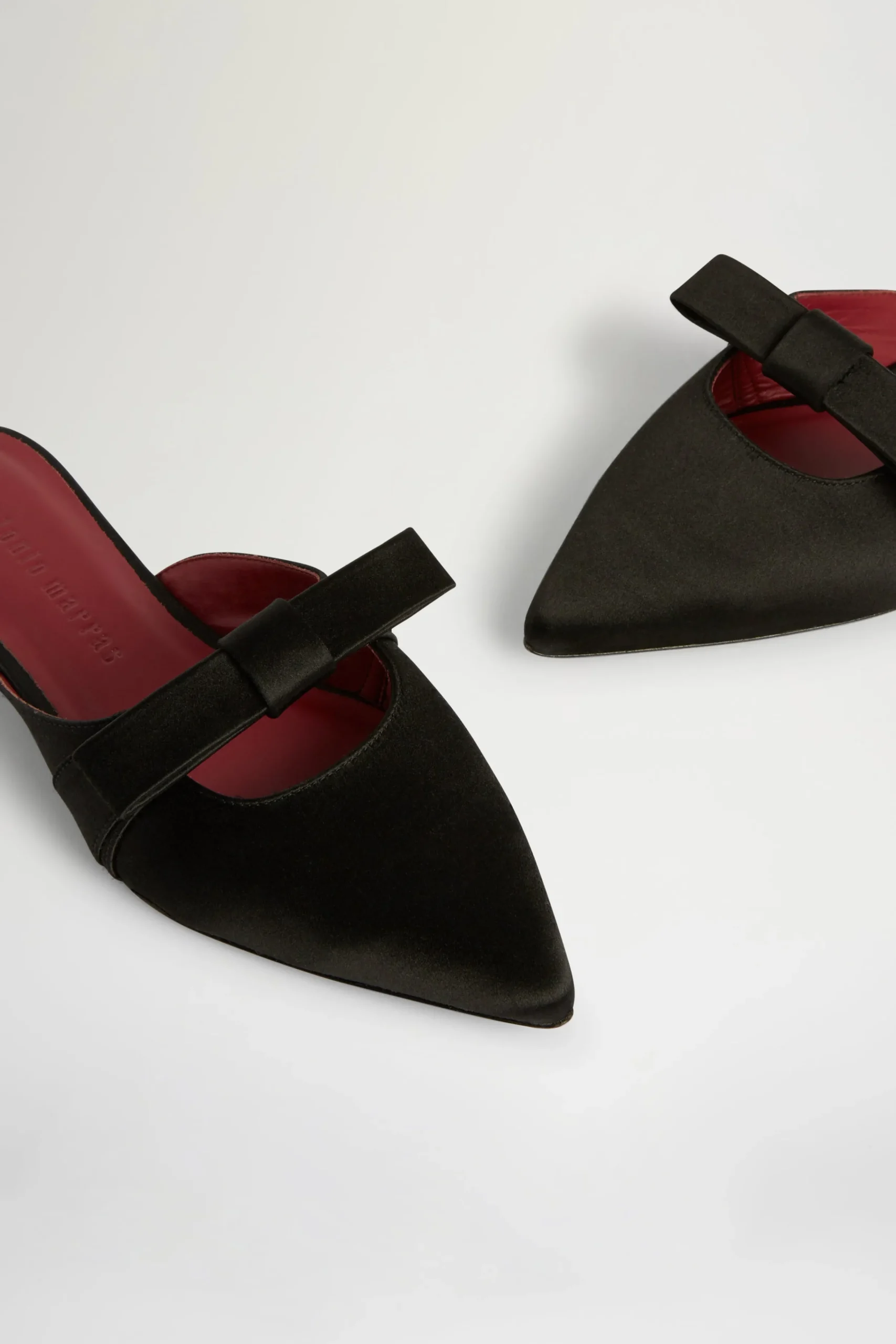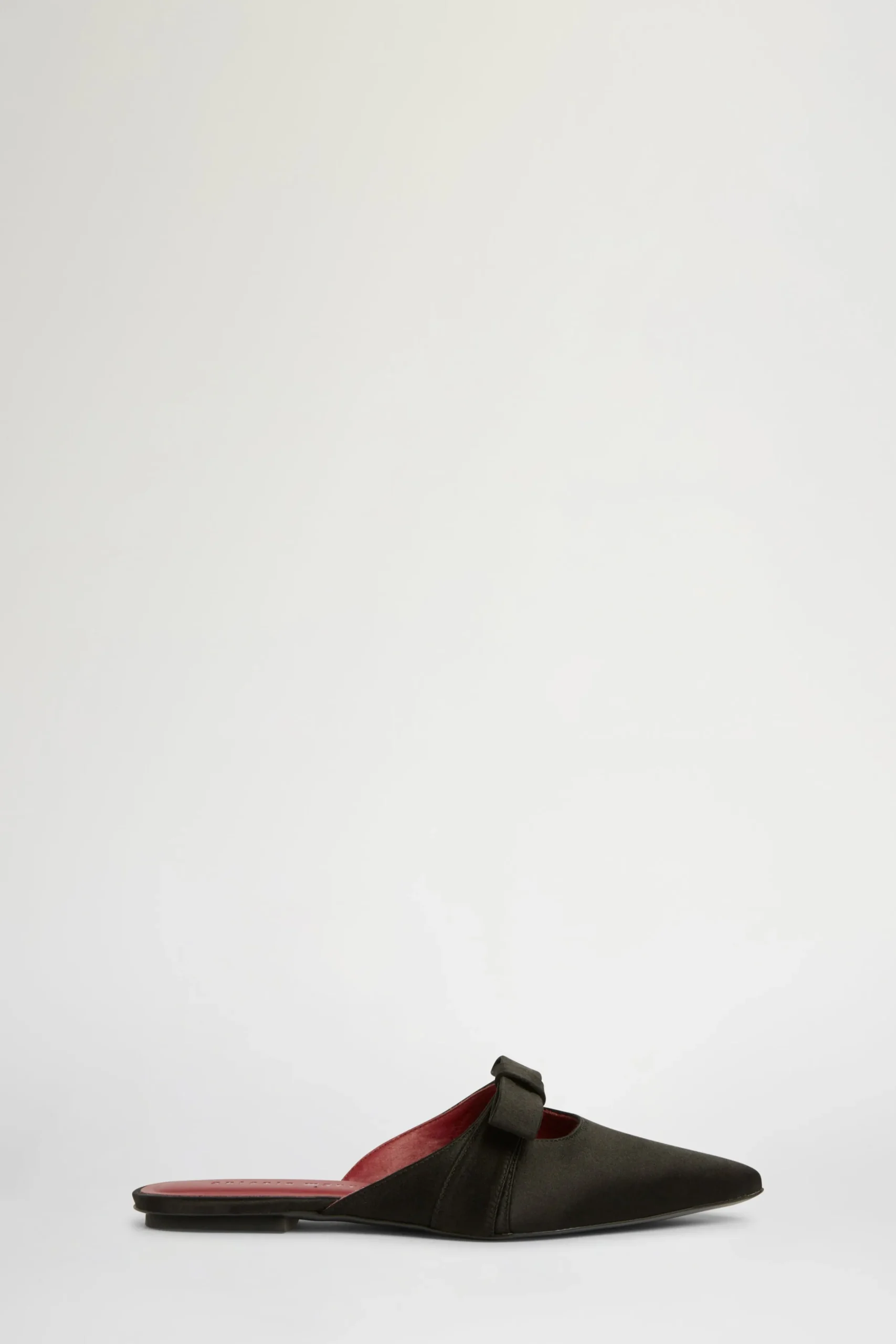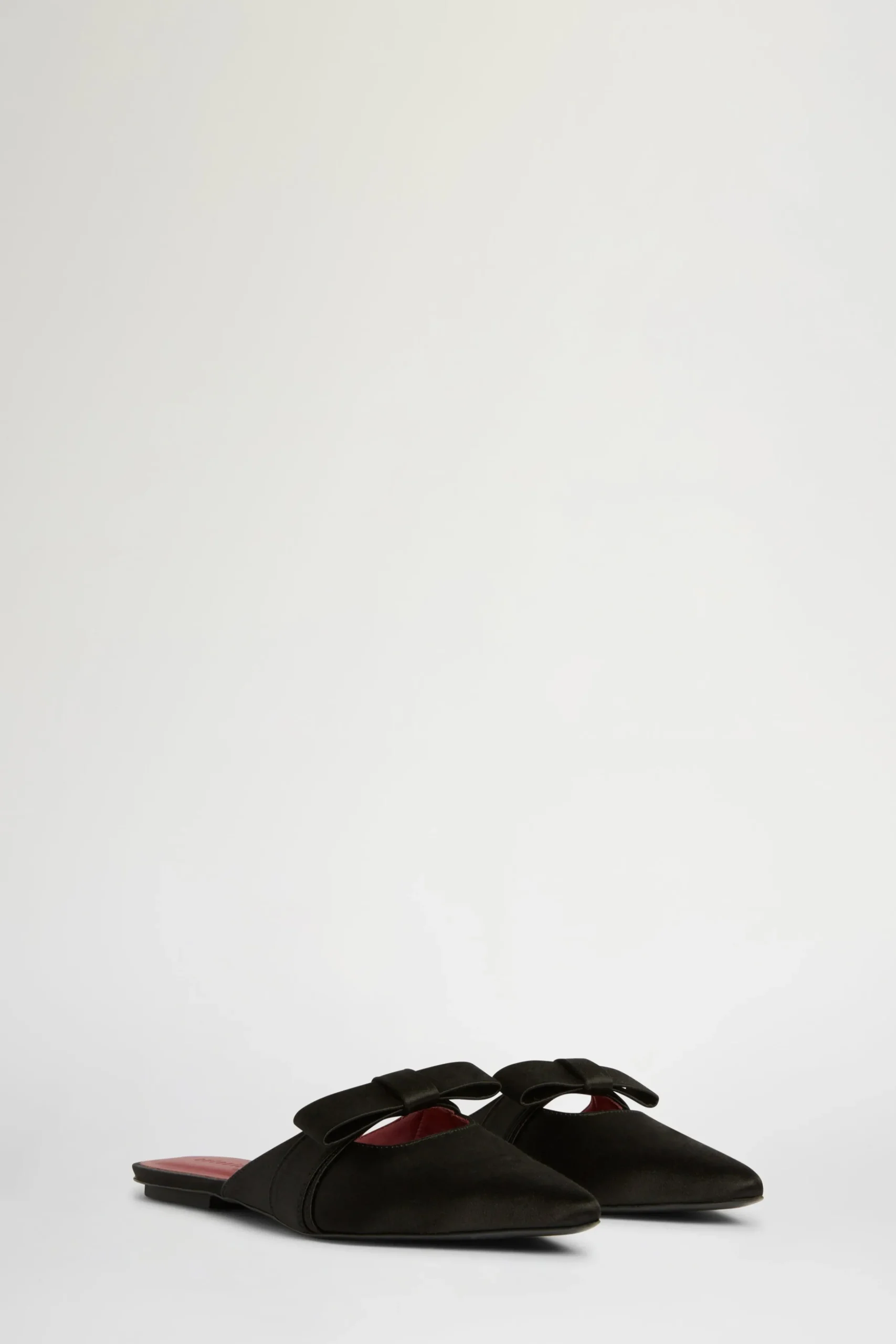 Mule piatte in satin nero con un fiocco e punta affilata.